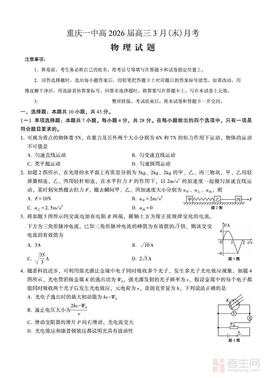 《重庆一中高2026届高三3月(末)月考 物理》是重庆一中面向高2026届高三学生推出的3月末物理学科阶段性测试资料,属于高中物理学科的重要备考资源。该资料结合重庆一中的教学体系与高三阶段物理学习进度,旨在通过标准化的阶段性测试形式,为学生提供符合本地教学要求与高考备考方向的练习素材,帮助学生提前适应考试场景与学科考查模式。