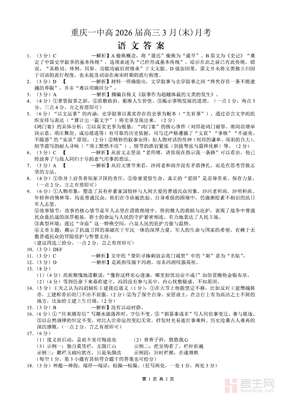 《重庆一中高2026届高三3月(末)月考 语文答案》是重庆一中针对高2026届高三学生在3月末组织的月考语文科目的配套参考答案资料。该考试属于高三阶段重要的阶段性检测,旨在考察学生当前语文知识掌握情况与综合应用能力,而本答案作为考试的核心配套资源,为师生提供了标准化的答题参考依据,是高三语文备考过程中不可或缺的阶段性反馈工具。