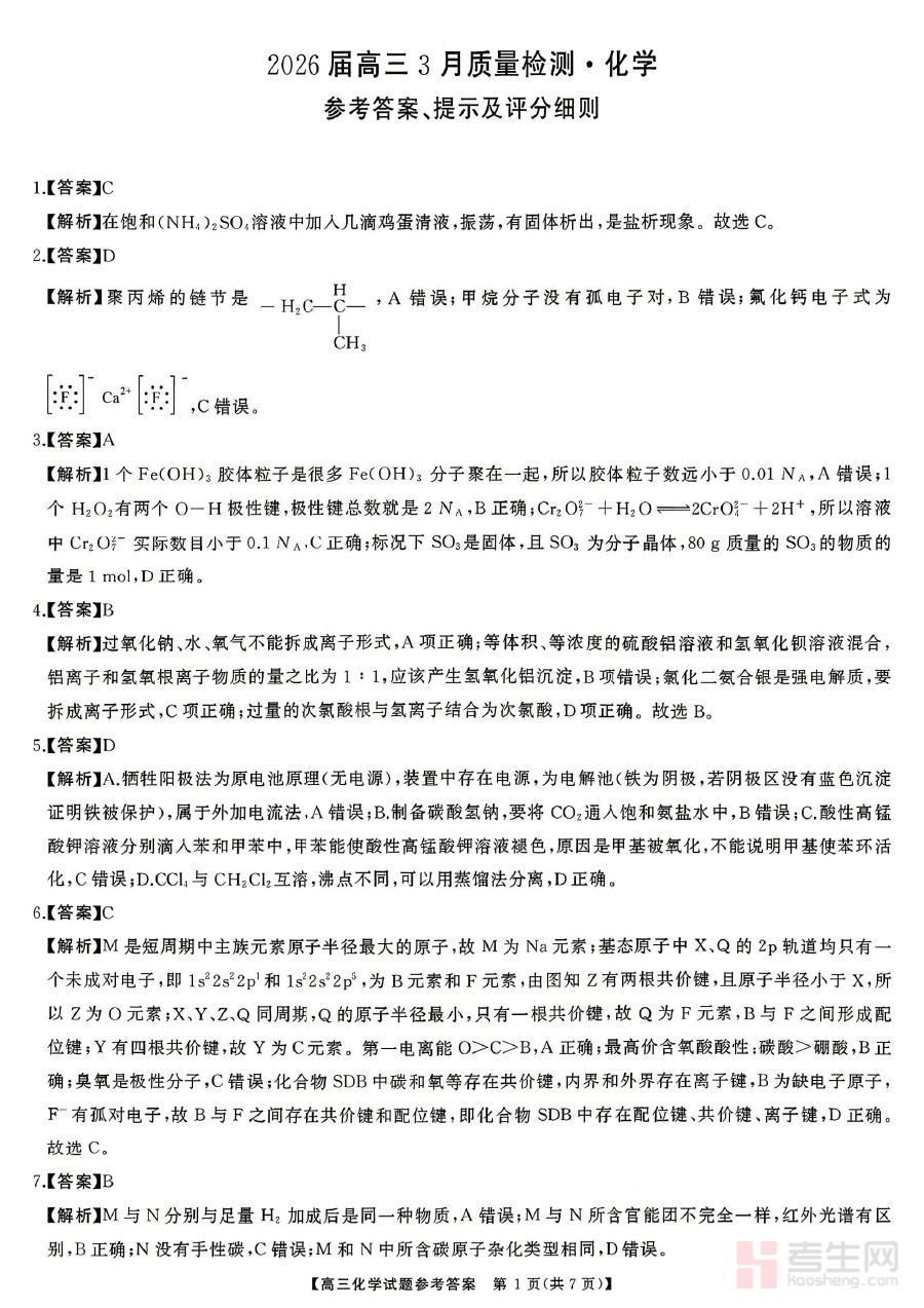 《化学试题卷答案 湖南天壹名校联盟2026届高三年级3月质量检测(3.30-3.31)》是湖南省天壹名校联盟针对2026届高三学生组织的3月质量检测的配套答案资料。该检测属于高三下学期重要的阶段性评估考试,覆盖联盟内多所优质高中的高三学生群体,旨在通过统一命题与检测全面评估学生化学学科知识掌握水平、解题能力及应试技巧,本答案为此次检测提供了权威标准的解答参考依据。