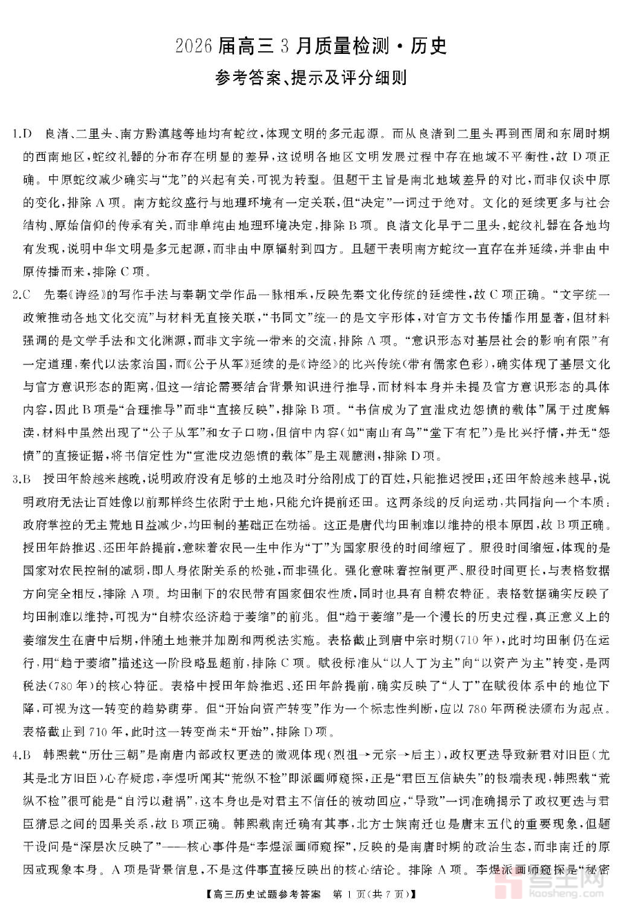《湖南天壹名校联盟2026届高三下学期3月质量检测历史试卷答案》是湖南省内天壹名校联盟针对2026届高三学生在高三下学期3月组织的历史学科质量检测所配套的官方答案资料,属于高三备考进程中关键的阶段性反馈工具,旨在为师生提供权威的作答参考依据。该资料依托联盟统一组织的检测活动,聚焦高三下学期中期的历史学科学习成效,是连接日常复习与高考冲刺阶段的重要衔接资源。