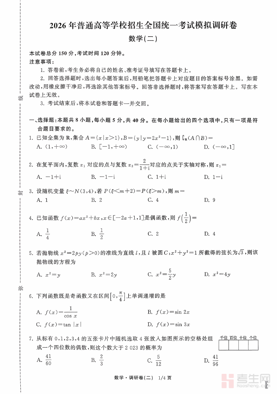本试题适用于辽宁省抚顺市清原满族自治县高级中学2025-2026学年高三下学期的学生及相关数学教师;对于学生而言,完成该模拟调研卷可提升应试能力与时间管理技巧,对于教师则能辅助优化教学策略,增强备考指导的针对性。