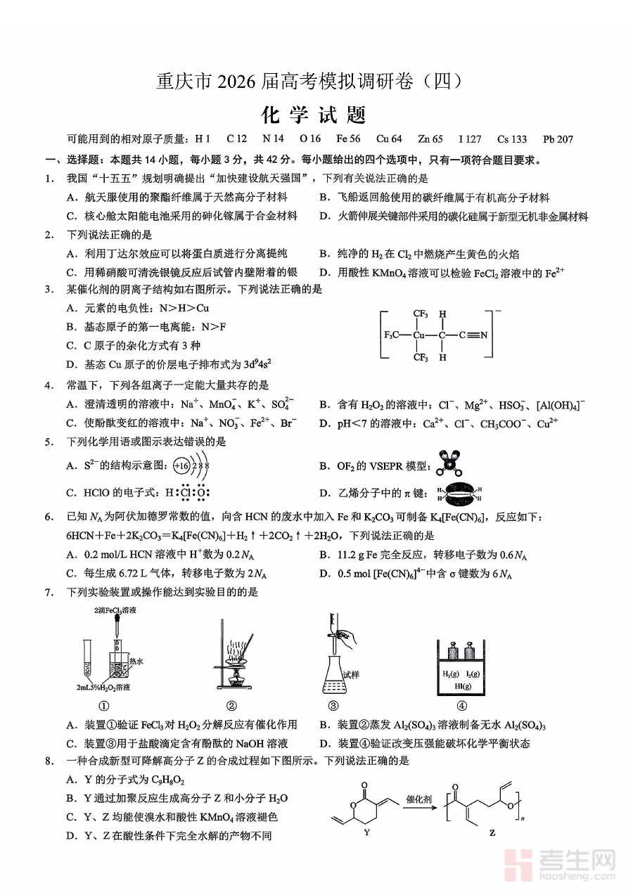《重庆市2026年普通高等学校招生全国统一考试康德调研(四)化学+答案》是针对2026年重庆市普通高等学校招生全国统一考试的化学学科阶段性调研资料,包含完整的调研试题与配套答案解析,属于康德调研系列的第四次调研内容,旨在为考生提供贴合本地高考命题趋势与考查方向的备考资源支持。