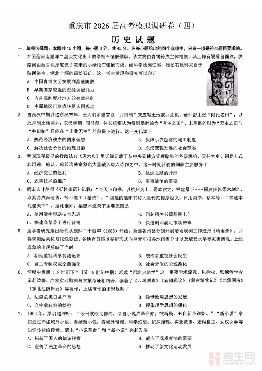 《重庆市2026年普通高等学校招生全国统一考试康德调研(四)历史+答案》是面向2026年重庆市普通高等学校招生全国统一考试的历史学科调研类备考资料,紧密贴合重庆市高考历史科目的考查方向与命题特征,依托康德调研体系的专业命题框架打造,为考生提供了与高考要求高度适配的阶段性练习资源。