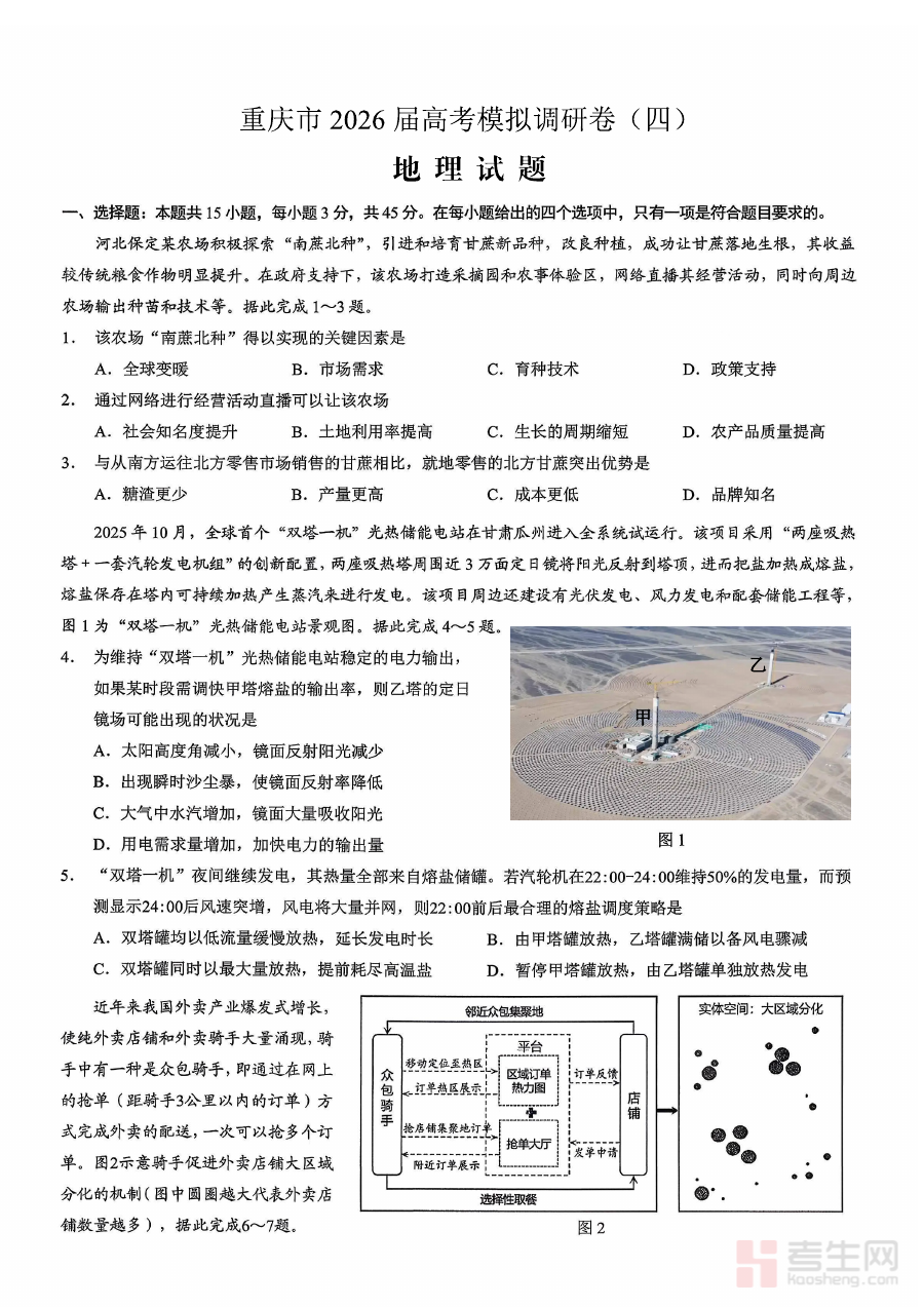 本资料适用于2026届重庆市参加普通高等学校招生全国统一考试的地理学科考生,作为第四阶段的调研测试资料,其价值在于帮助考生熟悉高考地理的考查方向与节奏,助力考生科学规划后续备考重点,提升备考效率与针对性。