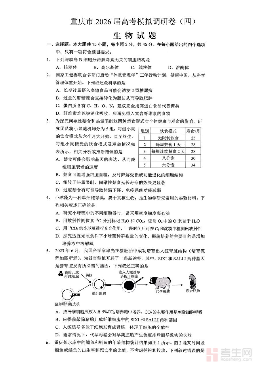 《重庆市2026年普通高等学校招生全国统一考试康德调研(四)生物+答案》是针对2026年重庆市普通高等学校招生全国统一考试生物学科的阶段性调研资料,由康德机构命题并配备参考答案。该资料紧密贴合重庆市高考生物科目的考情特点与命题趋势,旨在为考生提供符合本地备考需求的复习资源,帮助考生提前熟悉高考生物的考查模式与核心方向,为后续系统复习与能力提升搭建基础框架。