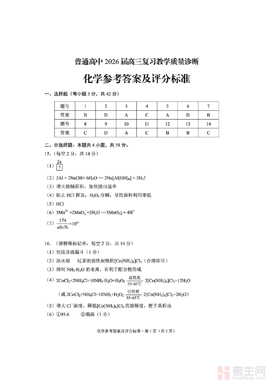 《2026届昆明高三市统测(二)化学答案》是针对2026届昆明市高三学生第二阶段市级统一检测的化学学科配套答案资料,属于区域性高三阶段备考的重要参考文件,能够为考生和教学者提供该次统测化学科目的标准解答依据。