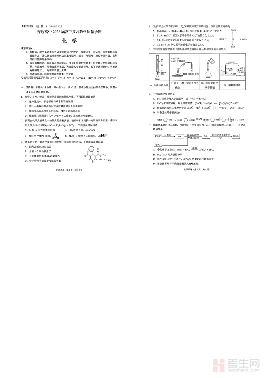 此试卷主要适用于2026届昆明市高三在读学生,特别是处于二轮复习阶段的学生进行自我评估与备考训练,通过完成该试卷,学生可有效检验近期化学知识的掌握程度与应用水平,为后续的针对性复习与备考规划提供数据支撑,进一步强化自身的化学学科核心素养,为市级统测及高考做好充分准备。
