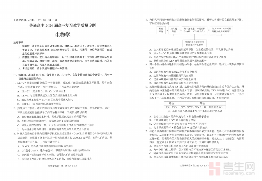 本资料主要适用于2026届高三年级生物学科学生、一线生物教师及高中生物教学研究者。对学生而言,它能帮助其熟悉市级统考的命题风格与考查维度,提升应试能力与解题技巧;对教师而言,它提供了真实的考试样本与参考答案,有助于优化教学设计与备考指导;对教学研究者而言,它可作为分析市级生物考试趋势、研究命题规律的重要参考依据,具有显著的实用价值与参考意义。