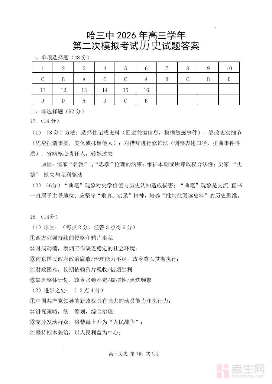 《哈三中2026年高三学年第二次模拟考试 历史答案》是哈尔滨第三中学为2026届高三学生组织的第二次模拟考试配套的历史学科答案资料,属于高三阶段关键的阶段性考试辅助材料,与对应模拟考试试卷形成完整的备考资源组合。