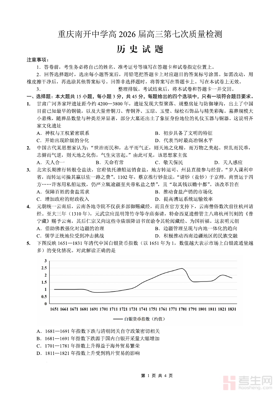 《重庆市南开中学高2026届高三第七次质量检测 历史》是面向重庆市南开中学高2026届高三学生的历史学科阶段性质量检测资料,属于高三备考过程中的重要阶段性评估内容。该资料依托学校的教学规划和高三阶段的复习进度设计,旨在通过标准化的检测形式,帮助学生和教师了解当前历史学科的学习状况,为后续的复习调整提供依据。