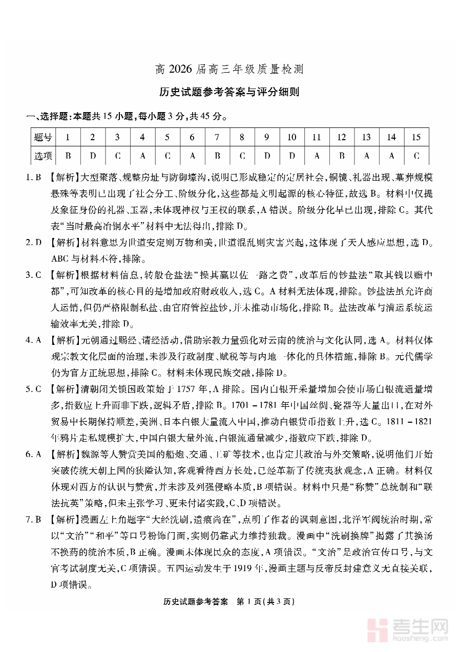 《重庆市南开中学高2026届高三第七次质量检测 历史答案》是重庆市南开中学针对高2026届高三学生组织的第七次阶段性质量检测的历史学科配套答案资料。该检测属于高三学年备考周期内的重要内部评估环节,旨在通过阶段性测试了解学生历史学科的学习进展与知识掌握情况。作为配套答案资料,它为检测结果的核对与分析提供了权威参考依据,是连接检测过程与后续学习调整的关键载体。