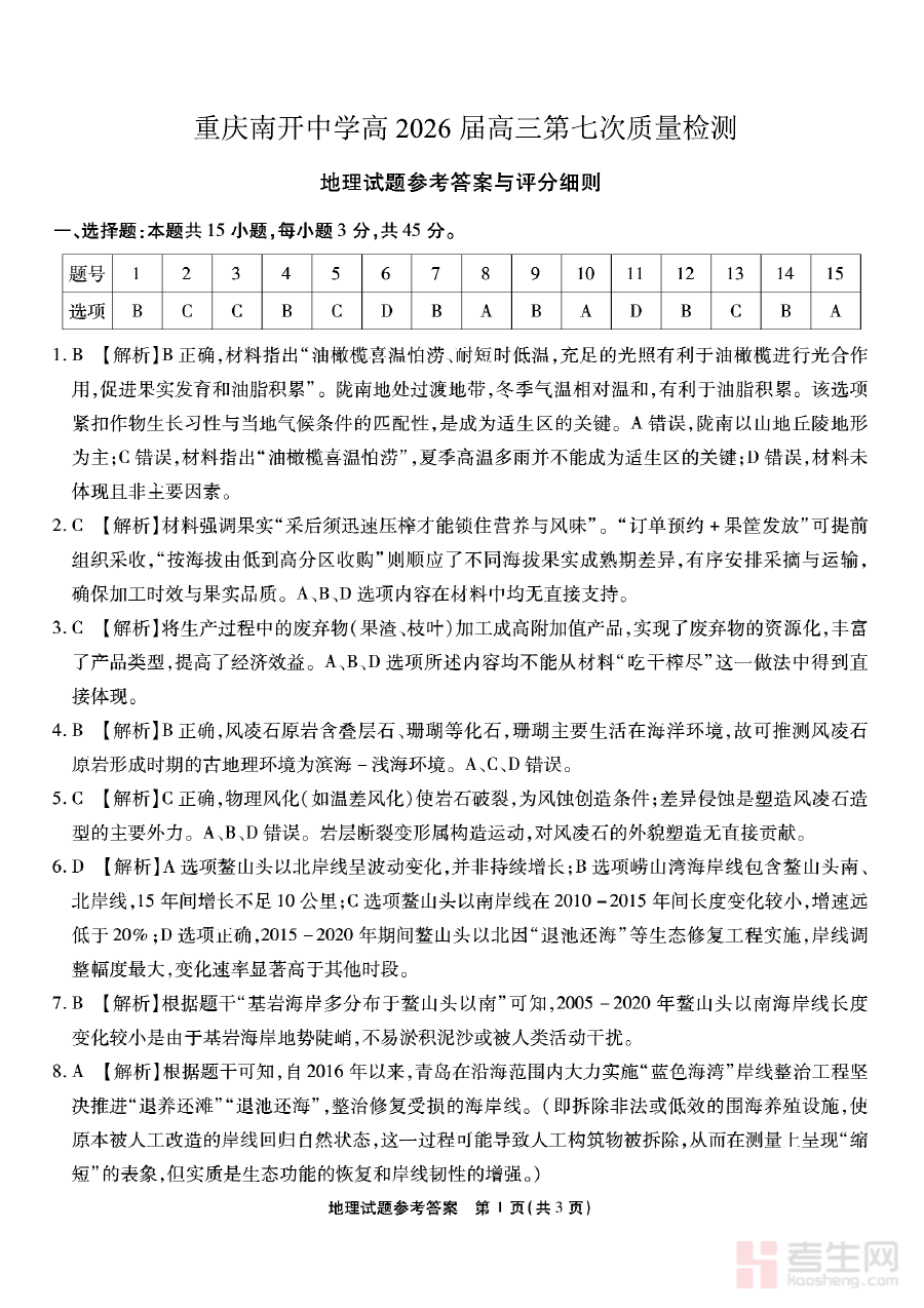 《重庆市南开中学高2026届高三第七次质量检测 地理答案》是重庆市南开中学针对高2026届高三学生组织的第七次质量检测的地理学科配套答案资料,该检测属于高三阶段的阶段性质量评估考试,旨在通过规范的检测体系和贴合本地教学实际的命题方向,为学生提供符合高考备考需求的学习效果评估依据。