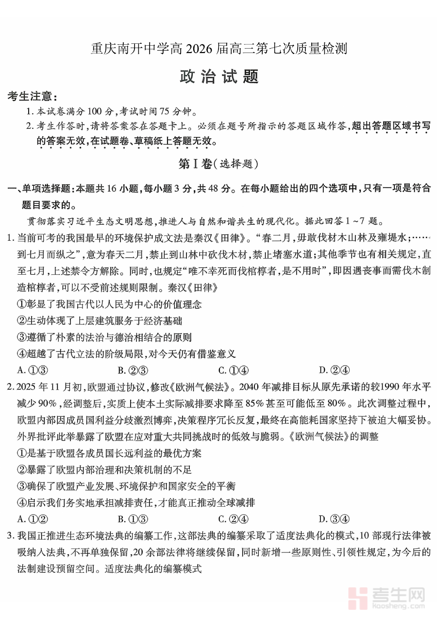 此资料主要适用于重庆市南开中学高2026届高三学生,同时也可为其他同类学校高三政治学科师生提供阶段性检测的参考范式。作为高三阶段的第七次质量检测,它不仅能帮助学生适应高考政治的考查情境与节奏,还能通过阶段性评估推动学生优化备考策略,提升政治学科的综合应试能力与核心素养,为后续高考冲刺奠定坚实基础。