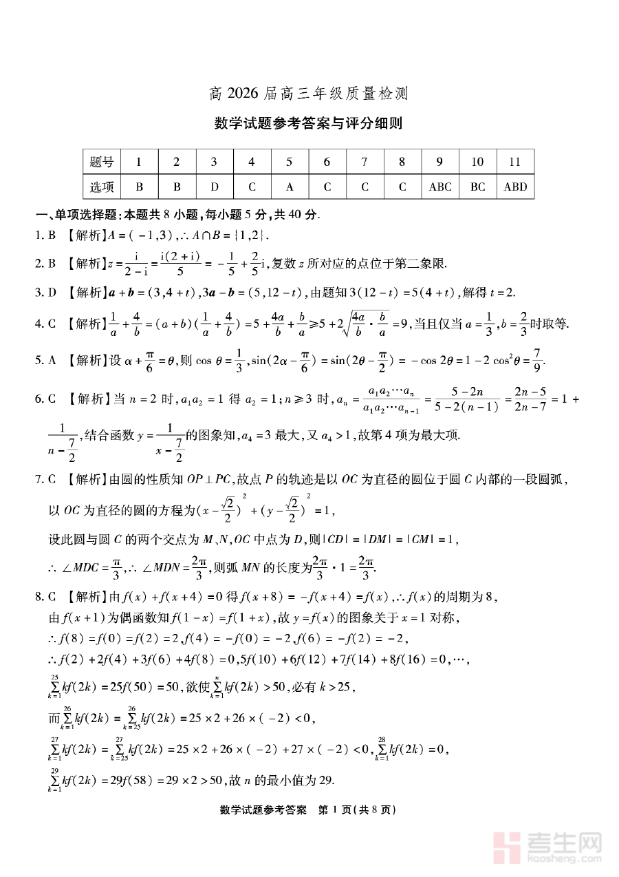 该答案主要适用于重庆市南开中学高2026届高三学生及数学教师群体。对于学生而言,它是自我评估学习效果、开展查漏补缺的实用工具;对于教师而言,它是开展教学反思、制定个性化辅导方案的关键参考;同时,也可为其他处于相似备考阶段的高三师生提供阶段检测的参考范例,助力提升整体备考效率与质量。