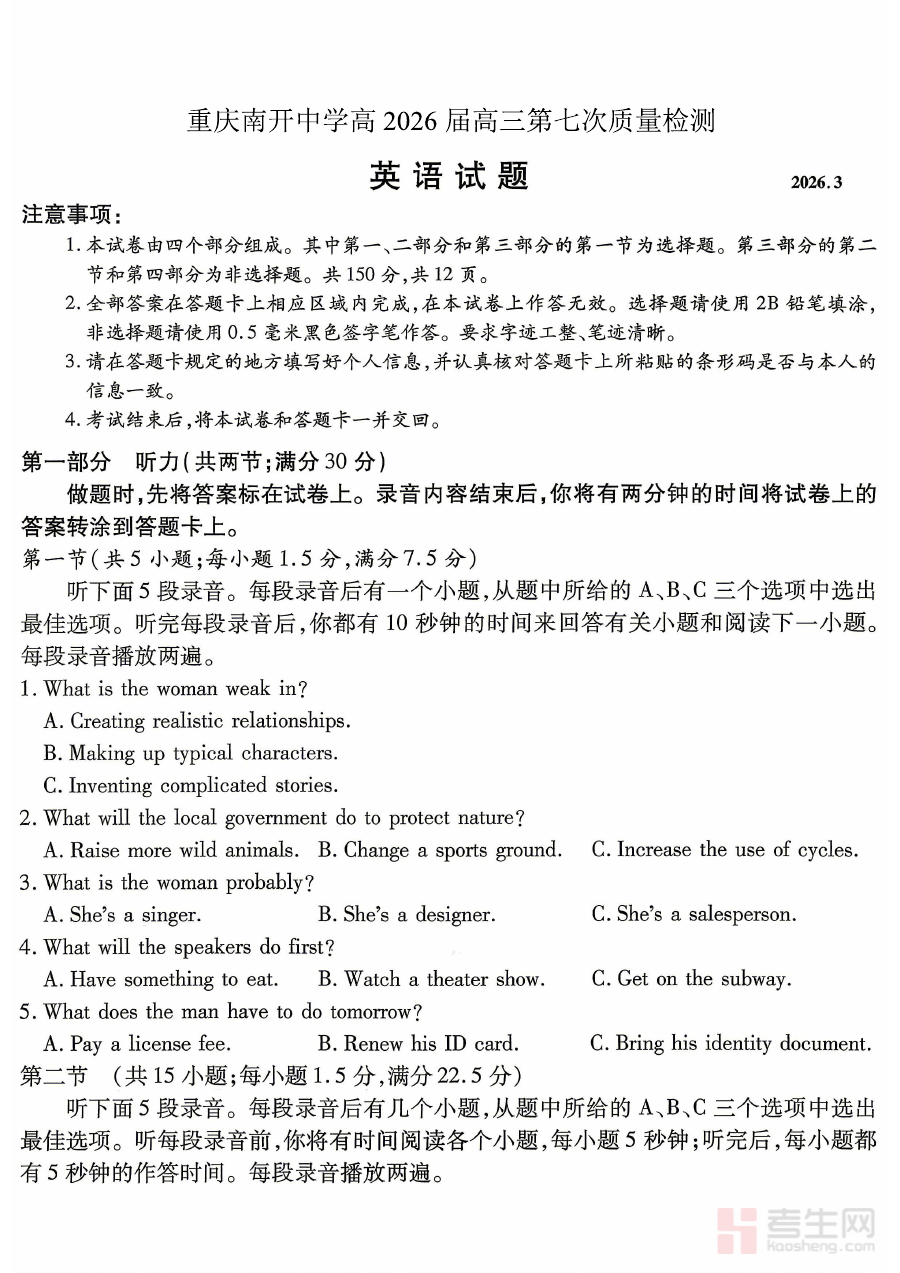 《重庆市南开中学高2026届高三第七次质量检测 英语》是重庆市南开中学针对高2026届高三学生开展的第七次阶段性英语质量检测资料,属于区域内具有代表性的高中英语备考资源。该检测紧密结合高三阶段英语学科的学习进度与能力培养目标设计,能够有效反映学生当前的英语学习状态,为后续的复习备考提供清晰的方向指引。