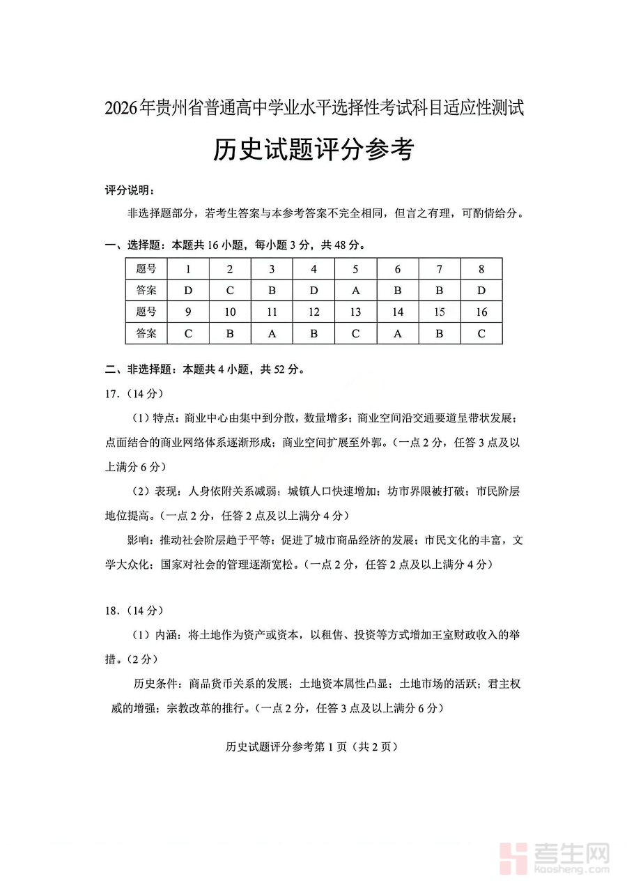 本资料主要适用于2026届贵州省普通高中即将参加学业水平选择性考试的学生群体,借助该官方答案进行适应性测试的结果评估,学生能够清晰把握自身历史学科的学习状况,为阶段性学习成果检测提供可靠依据,同时助力科学规划复习进度与方向,提升整体备考效率。