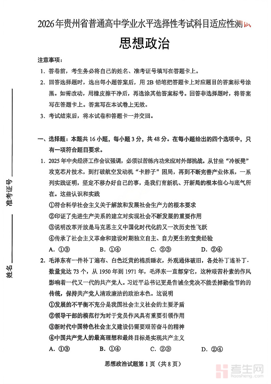 《政治试卷-2026年贵州省普通高中学业水平选择性考试科目适应性测试》是专门针对2026年贵州省普通高中学业水平选择性考试政治科目的适应性测试资料,精准对接该地区当年的考试政策、考查目标与命题趋势,为考生构建与正式考试高度相似的测试环境,帮助考生提前熟悉考试的整体流程、题型结构与考查方向,是考生备考过程中不可或缺的重要参考资料。