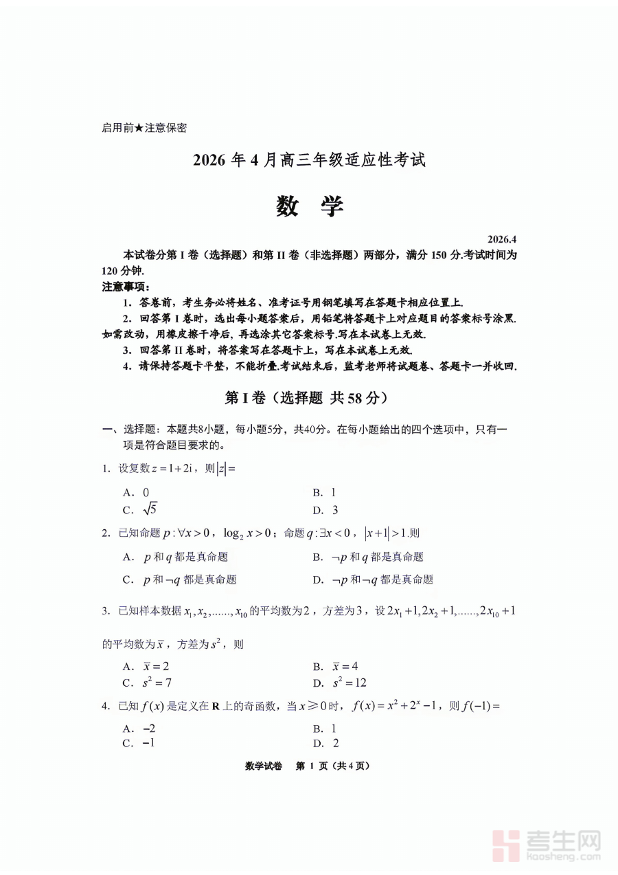 《数学试卷含答案-2026年贵州省普通高中学业水平选择性考试科目适应性测试》是2026年贵州省面向普通高中学业水平选择性考试推出的适应性测试资料,包含完整试卷及配套答案。该资料严格遵循贵州省学业水平选择性考试的命题导向与考核要求,为考生提供了贴近真实考试情境的练习载体,是备考该考试的核心参考资料之一。