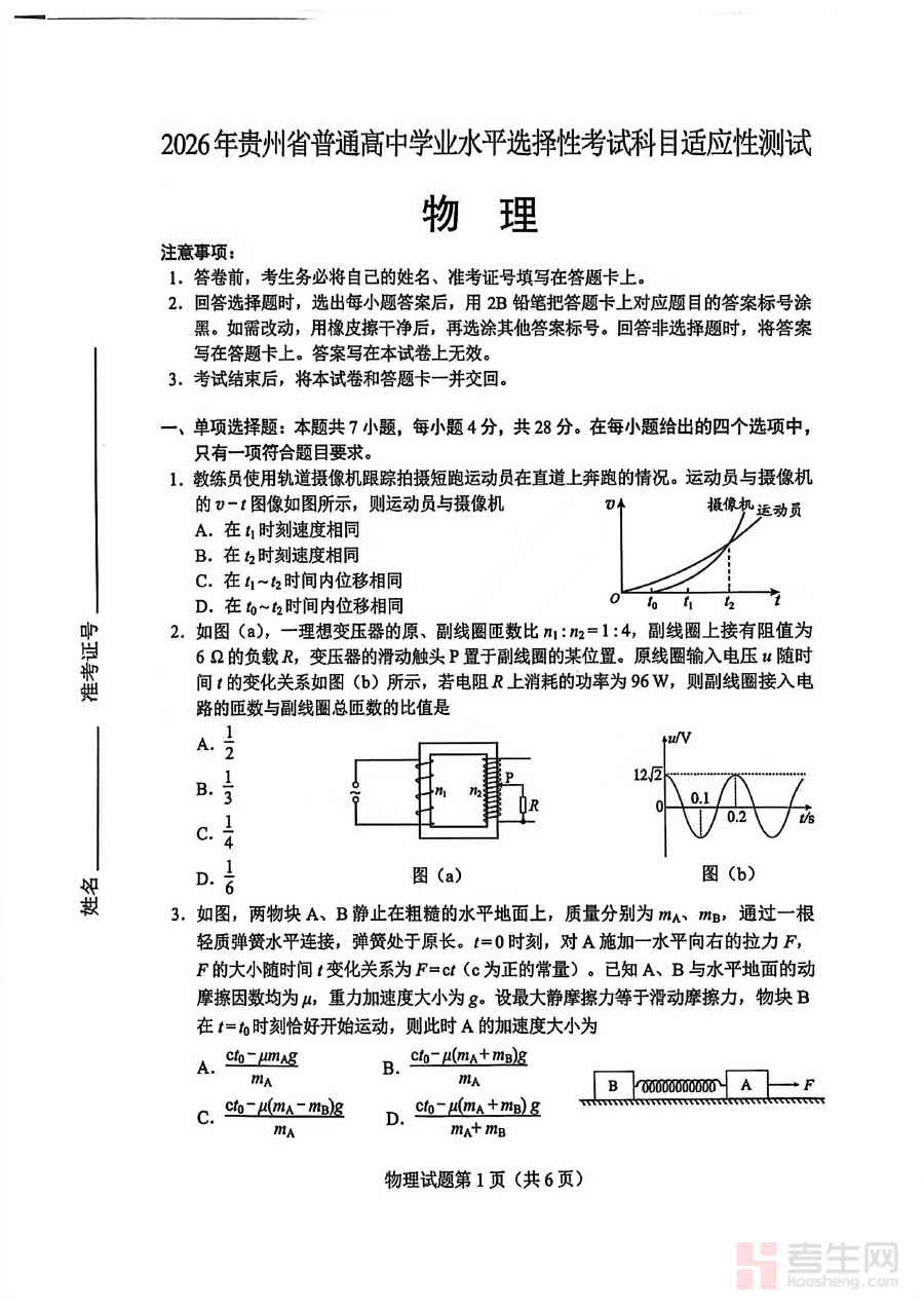 《物理试卷-2026年贵州省普通高中学业水平选择性考试科目适应性测试》是2026年贵州省针对普通高中学业水平选择性考试物理科目推出的适应性测试资料,旨在为即将参加该考试的考生提供贴近真实考试场景的练习机会,帮助考生提前适应考试的整体节奏与考查模式,是该考试备考阶段的重要参考资料。