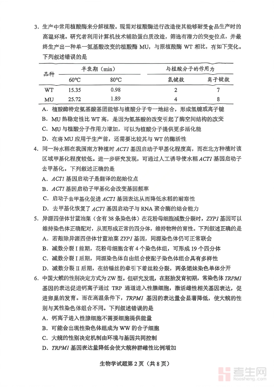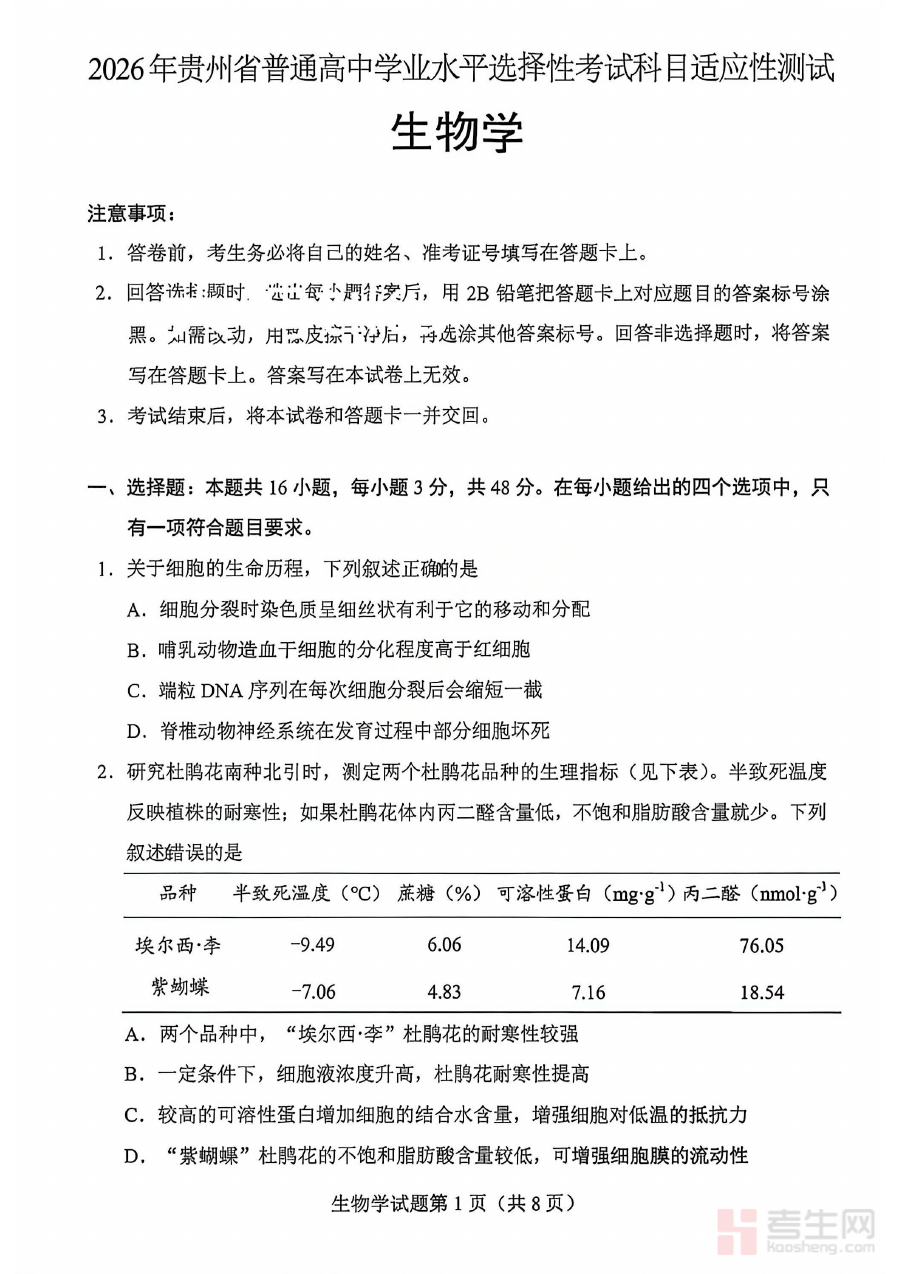 《生物试卷-2026年贵州省普通高中学业水平选择性考试科目适应性测试》是针对2026年贵州省普通高中学业水平选择性考试生物科目的适应性测试资料,紧密贴合该地区当年的考试政策与命题导向,为考生提供与正式考试形式、考查方向相匹配的练习载体,帮助考生提前熟悉考试的整体结构与核心考查维度。