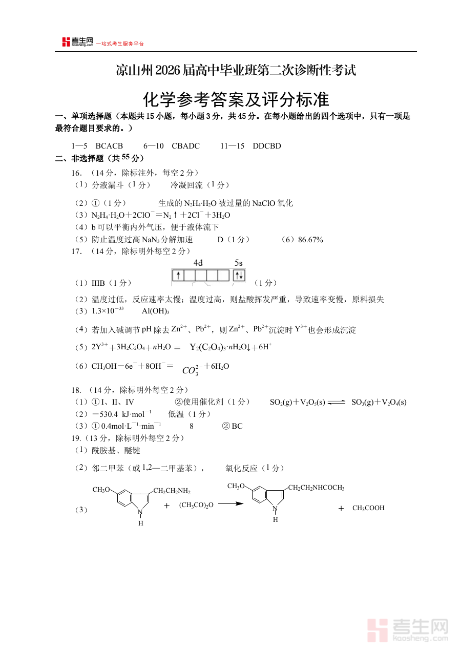 《凉山州2026届高中毕业班第二次诊断性考试 化学答案》是凉山州针对2026届高中毕业班组织的第二次诊断性考试的化学科目参考答案资料,属于高中三年级化学学科阶段性备考的重要辅助材料。该资料与凉山州本地高三化学教学进度及诊断考试要求紧密衔接,能够为考生和教师提供该次诊断考试化学科目的标准参考答案依据,是反映阶段学习成果的重要参考载体。