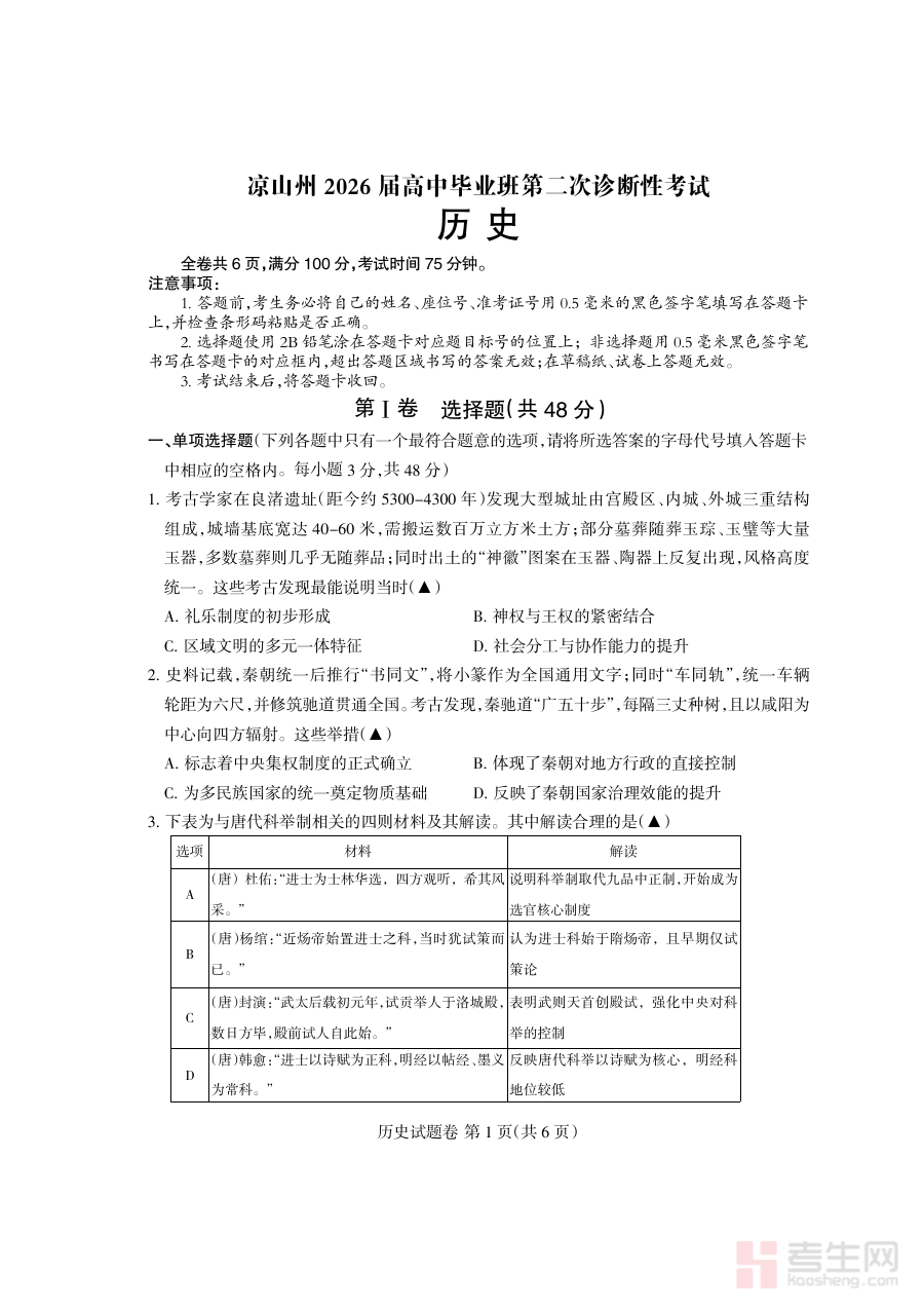 《凉山州2026届高中毕业班第二次诊断性考试 历史》是针对四川省凉山彝族自治州2026届高中毕业生设计的阶段性诊断考试相关备考资料,聚焦历史学科领域,贴合当地高中历史教学进度与考试要求,为该届学生提供与诊断考试适配的复习参考依据,助力学生提前适应诊断考试的考查模式与内容范围。