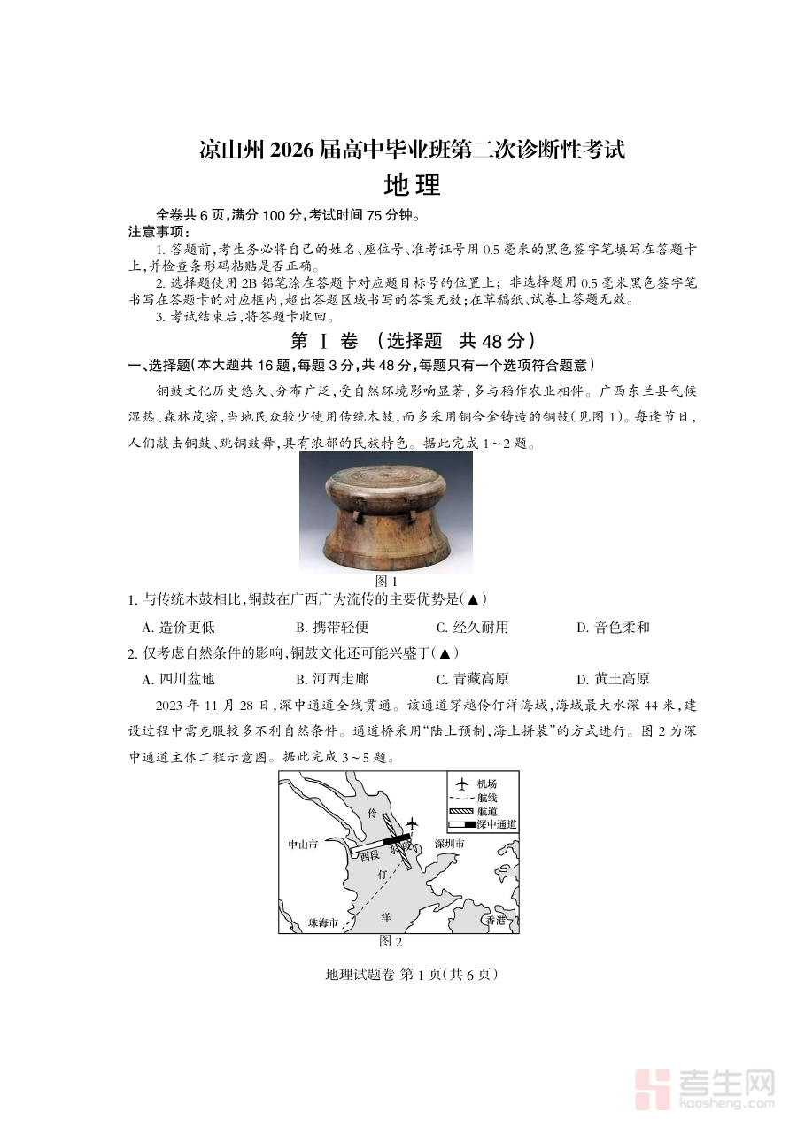 《凉山州2026届高中毕业班第二次诊断性考试 地理》是面向四川省凉山彝族自治州2026届高中毕业生的地理学科阶段性诊断考试相关备考资料,其考试类型为高中毕业班第二次诊断性考试,属于该地区高中阶段关键的教学质量监测与备考指导类资料,旨在通过标准化测试形式反映学生当前地理学科的学习状况与能力水平。