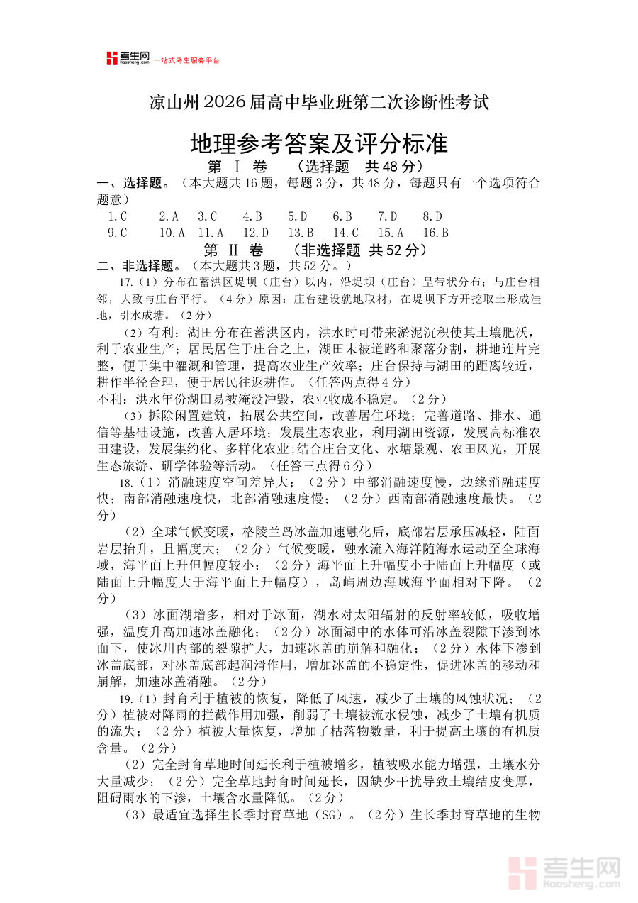 《凉山州2026届高中毕业班第二次诊断性考试 地理答案》是针对四川省凉山彝族自治州2026届高中毕业生第二次诊断性考试地理科目的配套参考答案资料。该考试作为区域内高中阶段重要的阶段性评价测试,旨在通过标准化检测形式反映学生地理学习的阶段性掌握情况,而本答案资料则是此次考试地理科目的官方参考依据,为相关使用者提供准确规范的答题对照标准。