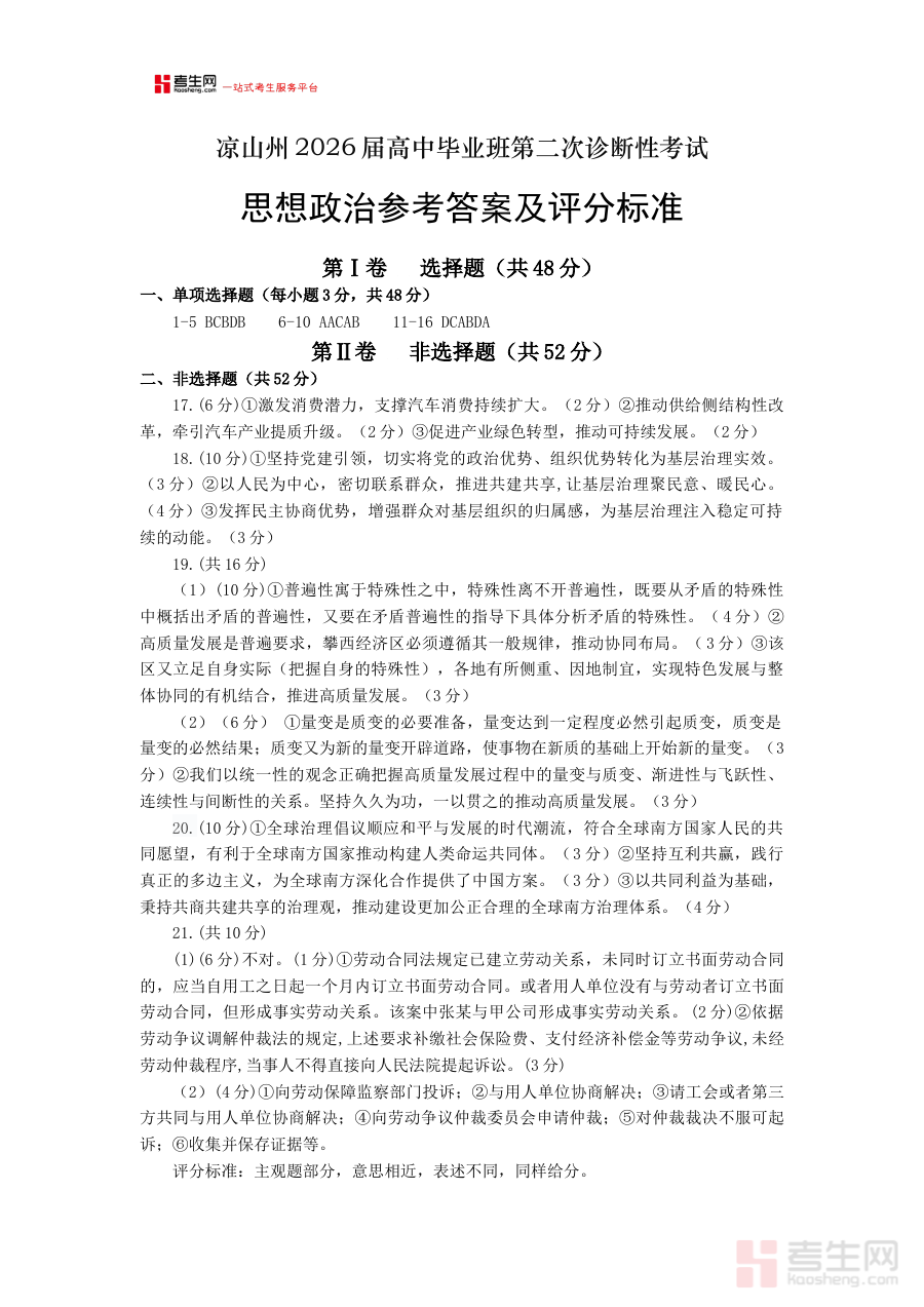 《凉山州2026届高中毕业班第二次诊断性考试 政治答案》是凉山州教育系统针对2026届高中毕业班学生组织的第二次诊断性考试中政治学科的官方配套答案资料,属于高中阶段关键的阶段性备考辅助材料。该资料紧密对应本次诊断考试的考查方向,为考生和教学工作者提供了该次考试政治学科的标准化作答参考,是衔接日常教学与高考备考的重要中间环节资料。