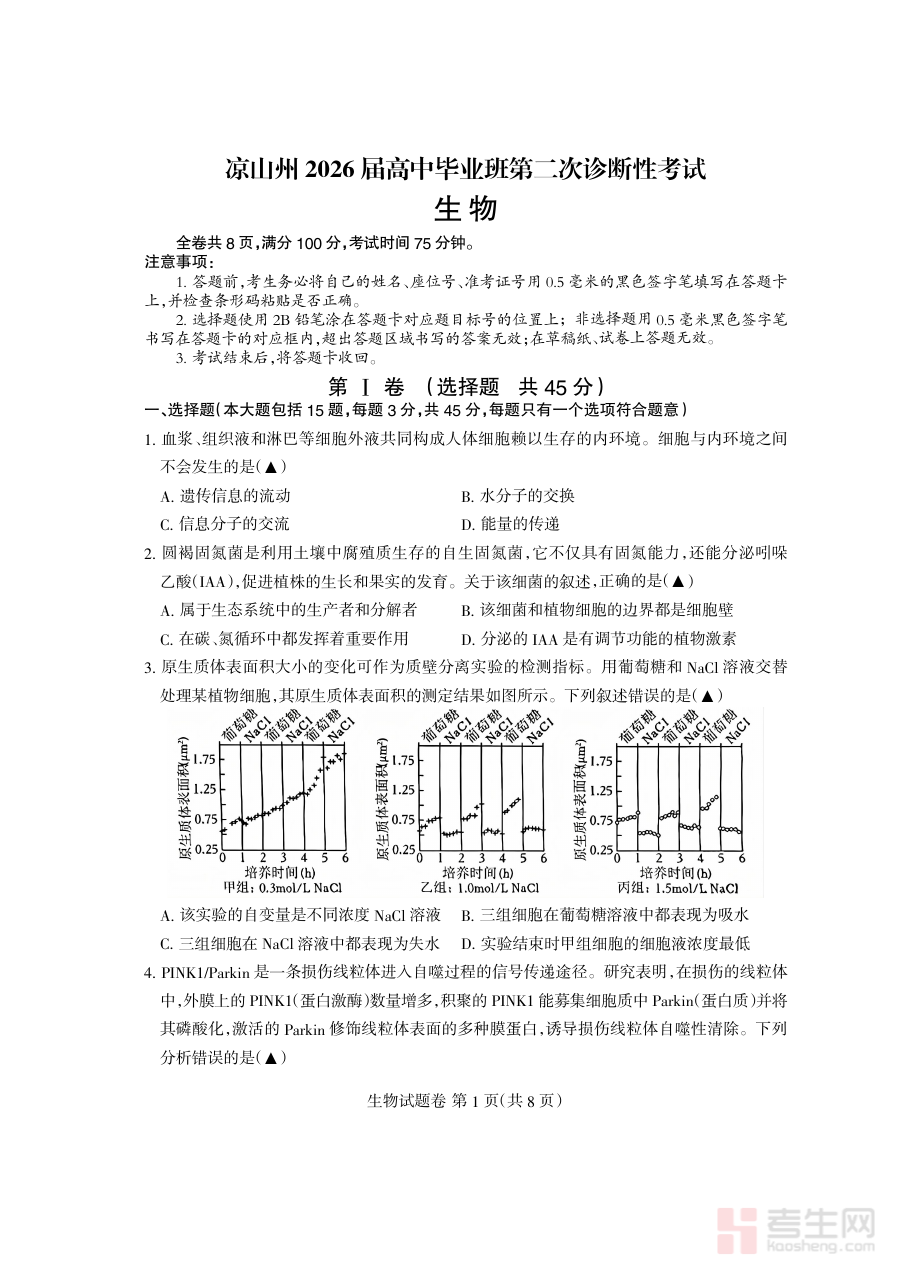该资料适用于凉山州2026届高中毕业班的学生、生物学科教师及相关教学管理工作者。对学生而言参与该考试或使用相关资料能清晰认知自身生物学科水平,明确复习重点;对教师来说可依据考试结果优化教学策略与内容;对管理者而言则能通过整体数据掌握区域生物教学状况,为教学质量提升提供决策支持。