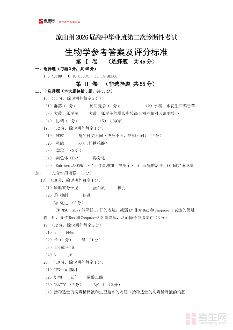 《凉山州2026届高中毕业班第二次诊断性考试 生物答案》是针对四川省凉山州2026届高中毕业生第二次诊断性考试的生物学科配套答案资料。该考试属于区域内高中阶段重要的阶段性诊断测试,旨在通过标准化评估反映学生生物学科的学习进展与知识掌握水平,为后续教学调整和备考规划提供客观依据。