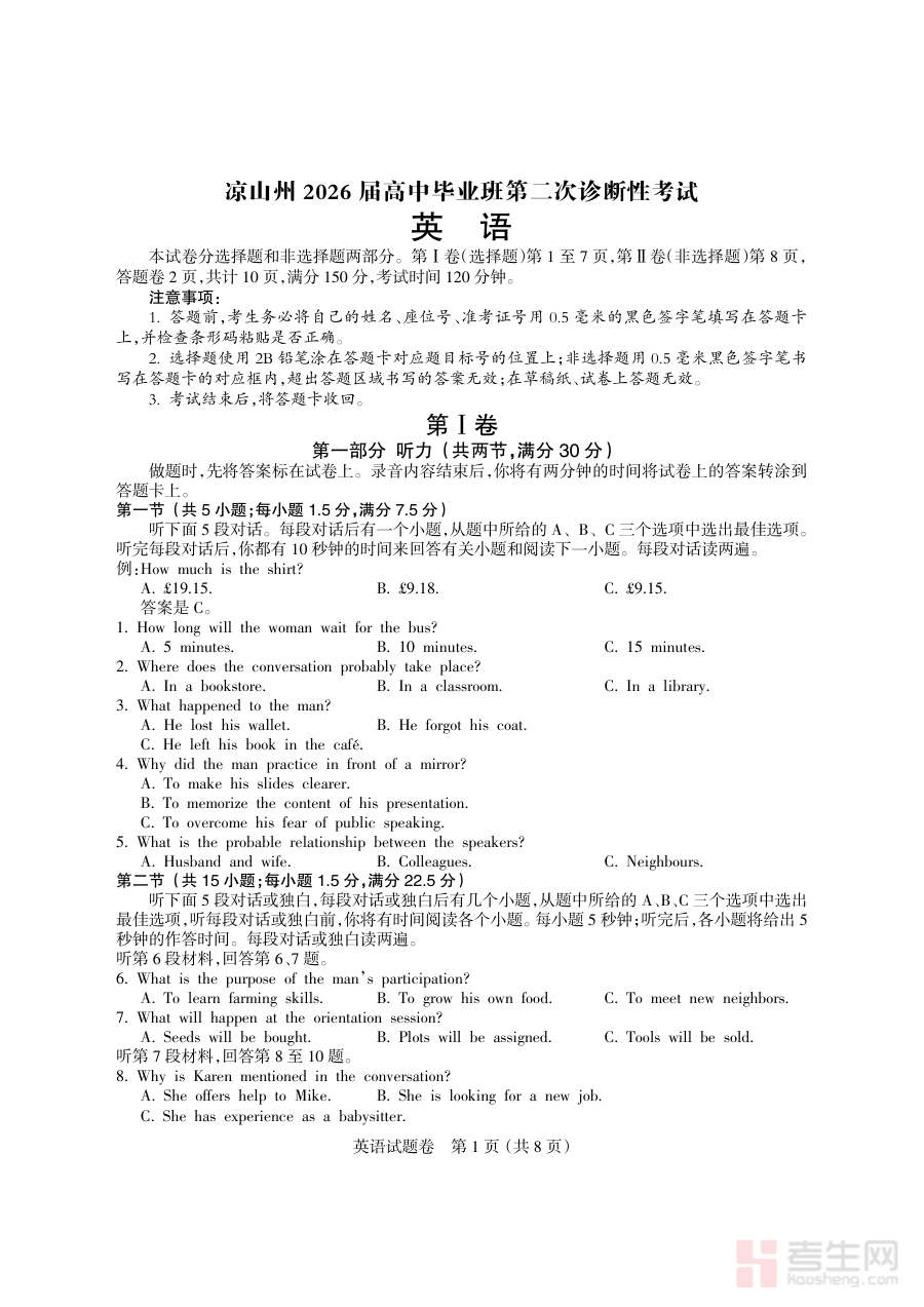 《凉山州2026届高中毕业班第二次诊断性考试 英语》是针对四川省凉山彝族自治州2026届高中毕业生设计的阶段性诊断考试资料,属于高中英语学科的重要备考资源。该考试作为区域内高中教学质量监测的关键环节之一,旨在通过标准化的测试形式,反映学生在高中阶段英语学习的阶段性成果,为后续教学调整和备考方向提供依据。它依托凉山州本地教育教学实际情况设置,符合区域内高中英语教学的整体进度和要求,是衔接日常教学与高考备考的重要桥梁。