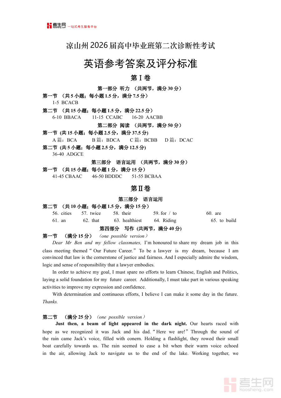 《凉山州2026届高中毕业班第二次诊断性考试 英语答案》是针对四川省凉山州2026届高中毕业生设计的阶段性诊断考试配套资料,属于高中英语学科重要的备考辅助文件。该考试作为当地高中阶段关键的诊断性测试之一,旨在通过标准化考查方式帮助师生了解当前学习进展与知识掌握情况,对应的答案则是这一过程中不可或缺的参考依据,为后续教学与学习调整提供基础支持。