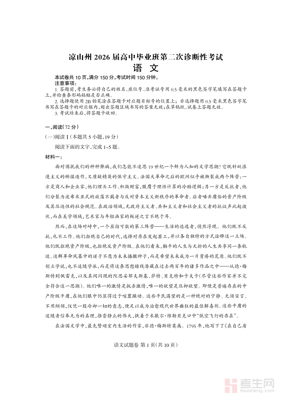《凉山州2026届高中毕业班第二次诊断性考试 语文》是针对凉山州区域内2026届高中毕业生设计的阶段性诊断考试资料,属于该届学生高中阶段重要的诊断性测试之一,旨在通过标准化的考试形式,为后续语文科目的备考提供客观的数据支撑与明确的方向指引。