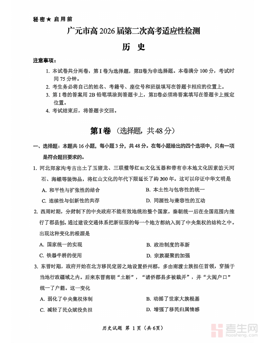 《广元市高2026届第二次高考适应性检测 历史》是广元市教育部门针对本地2026届高中毕业生组织的第二次高考适应性检测对应的历史学科资料。作为区域内高三阶段关键的阶段性备考资源,它紧密贴合当地高考备考的整体进度与学科要求,旨在通过标准化的检测形式帮助相关群体准确把握历史学科的备考方向、核心重点以及能力考查维度。