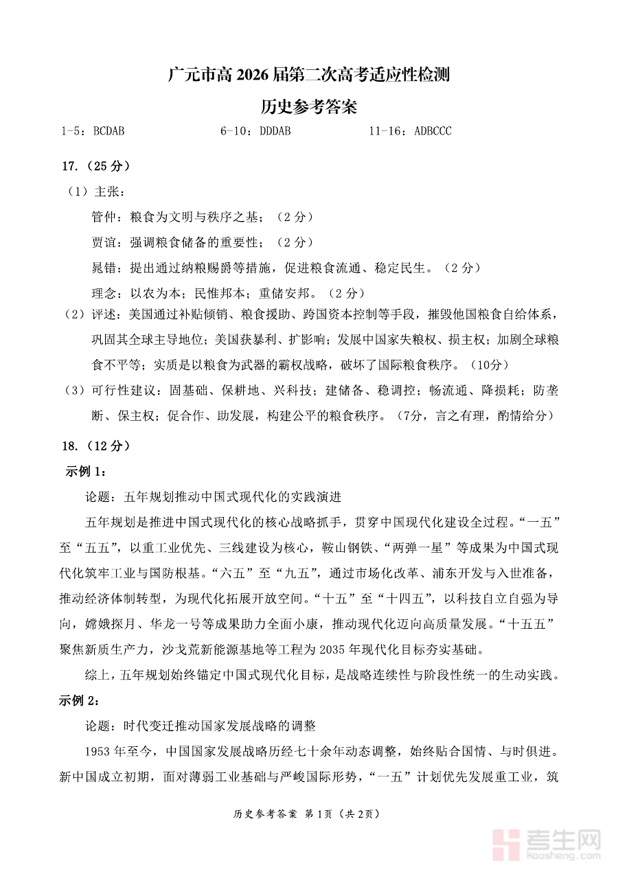 《广元市高2026届第二次高考适应性检测 历史答案》是广元市针对2026届高中毕业生开展的第二次高考适应性检测所配套的历史学科答案资料。该检测属于区域内高考前阶段性模拟评估考试范畴,旨在模拟高考的命题方向、考查维度与应试环境,为考生提供接近真实高考的实战演练机会,是广元市高中历史学科教学阶段总结与备考进程推进的关键参考资料之一。