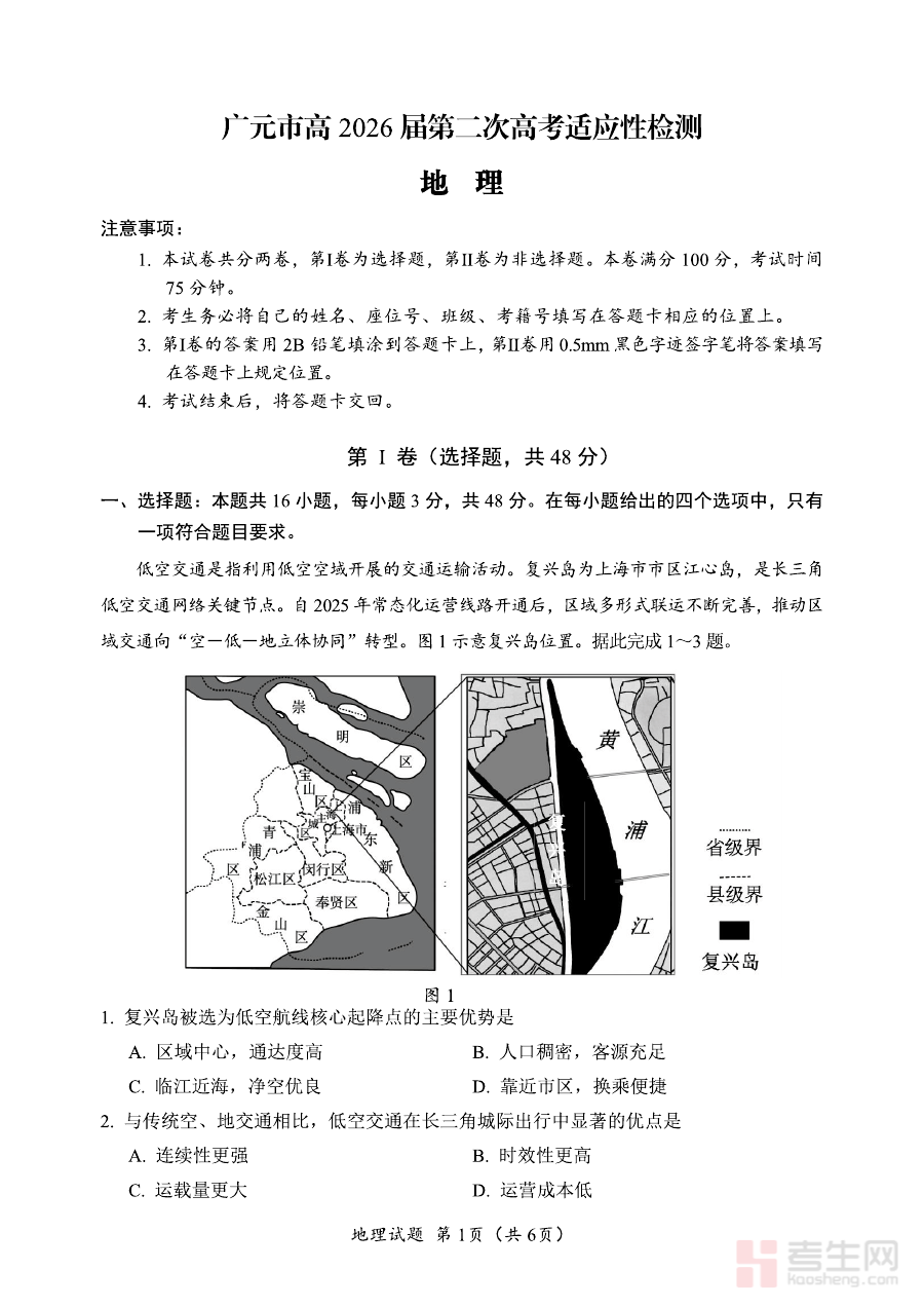 适用人群为广元市高2026届高中学生及地理学科教师,作为第二次高考适应性检测资料,其价值在于通过模拟高考的检测场景与要求,让学生提前熟悉高考地理的考查形式与难度定位,同时为教师的教学策略优化提供实际依据,推动备考工作更具针对性与有效性。