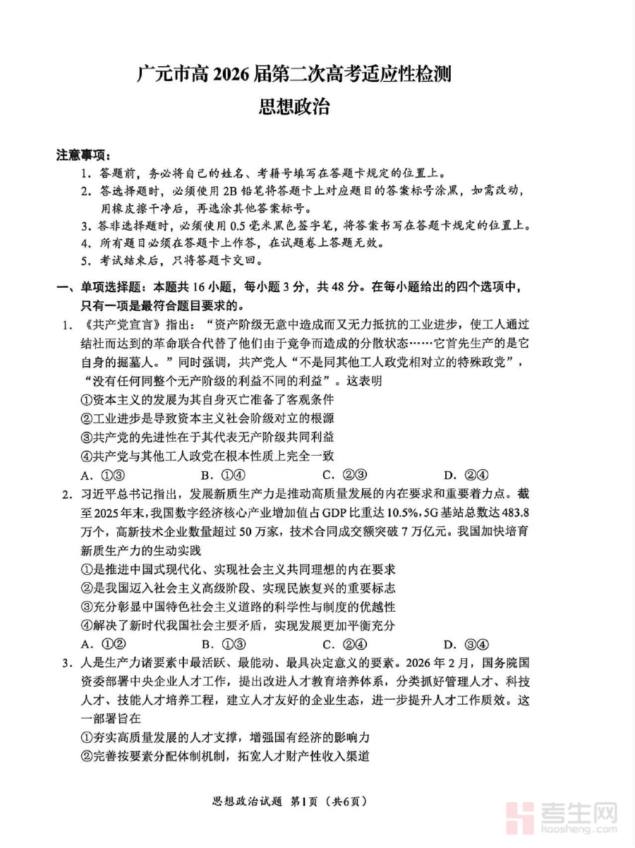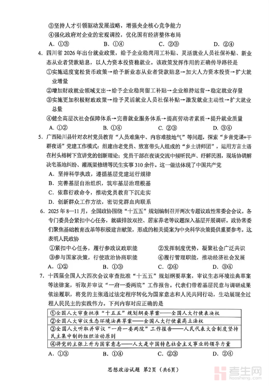 此资料适用于广元市高2026届的政治学科学生、担任该届教学任务的一线政治教师,以及参与高考备考指导工作的相关人员。作为第二次适应性检测资料,其价值体现在帮助学生巩固阶段性学习成果,提升应试技巧与学科素养;同时为教师优化备考方案、强化薄弱环节教学提供数据支撑,有效推动高考备考工作的高效开展,助力师生在后续复习中更具针对性与实效性。
