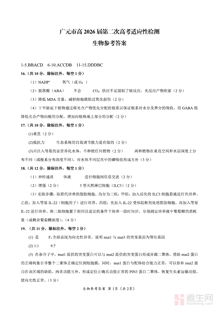 《广元市高2026届第二次高考适应性检测 生物答案》是针对广元市高2026届学生设计的第二次高考适应性检测生物学科配套答案资料。该检测属于区域内高三阶段重要阶段性考试范畴,旨在模拟高考命题方向与考查模式,为学生提供贴近高考实际的练习场景,而配套答案是该检测体系不可或缺的组成部分,帮助学生与教师快速获取检测结果的参考依据。