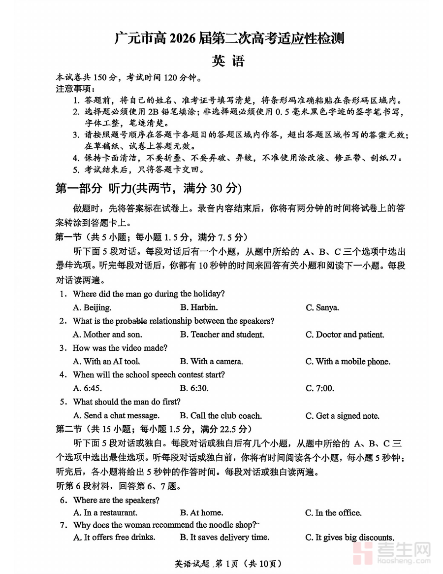 本资料适用于广元市高2026届高三学生、高中英语教师及相关教育管理工作者。对学生而言,它是阶段性自我评估与备考策略调整的关键工具;对教师而言,它是开展精准教学与个性化辅导的重要依据;对教育管理部门而言,它是制定科学备考政策的参考。通过该资料的应用可有效衔接教与学需求,推动高考英语备考向高效精准方向发展。