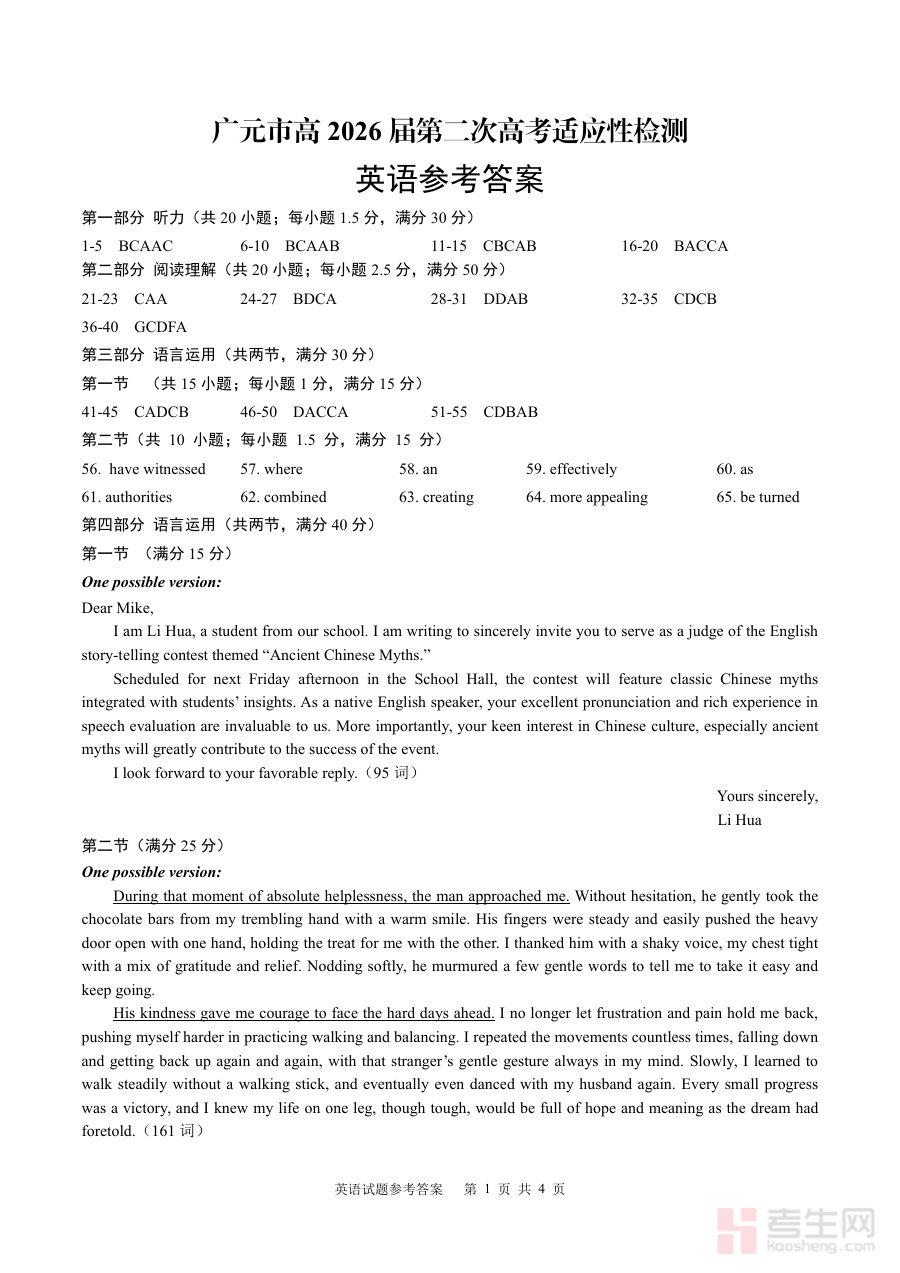 《广元市高2026届第二次高考适应性检测 英语答案》是广元市针对2026届高三学生开展的第二次高考适应性检测所配套的英语学科答案资料。该检测属于区域内高考备考进程中的重要阶段性评估环节,以模拟高考的形式帮助学生适应考试模式与时间管理,而配套答案则是该检测体系的核心组成部分之一,为检测结果的客观评定提供了标准化依据。