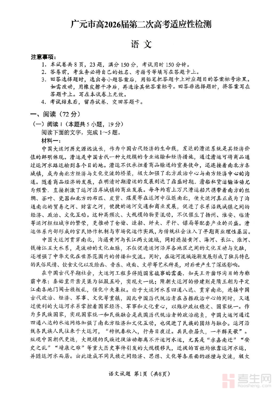《广元市高2026届第二次高考适应性检测 语文》是广元市针对2026届高三学生组织的第二次高考适应性检测的语文科目专用资料,属于区域性高考备考阶段检测类资源,旨在通过标准化的检测形式帮助相关群体了解当前阶段的语文学习状况与高考要求之间的差距。