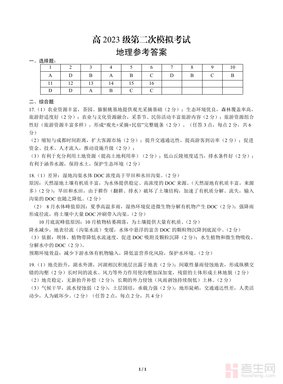 适用人群为广安市高2023级的学生、地理教师以及相关教学教研人员。该资料作为阶段性模拟考试的答案参考,能够有效支持考生进行自我评估和查漏补缺,帮助教师精准把握学生的学习动态,对于提升阶段检测的有效性和备考规划的针对性具有重要意义。