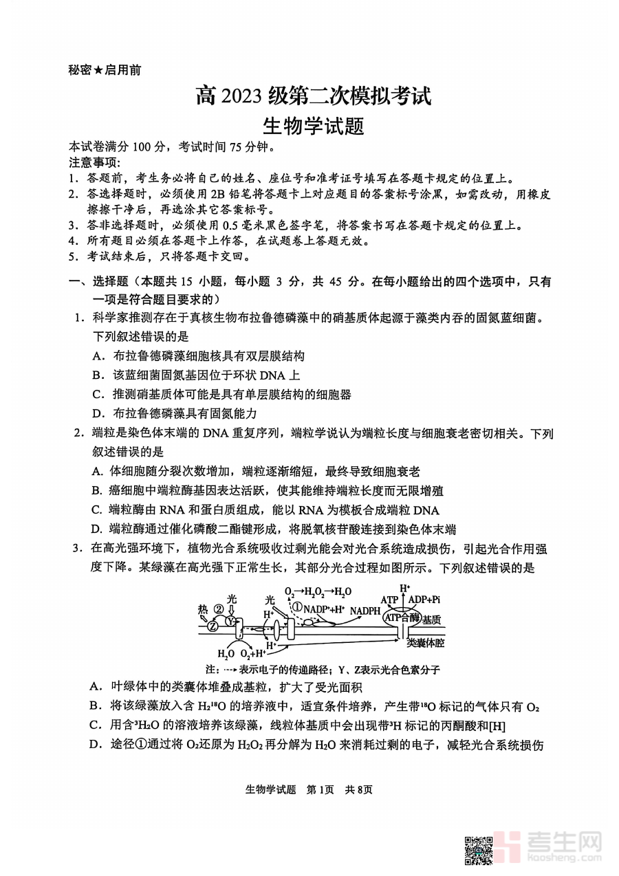 《广安市高2023级第二次模拟考试 生物》是广安市针对高2023级学生组织的第二次阶段性模拟考试对应的生物学科资料,属于区域内标准化的学业水平检测资料。该资料贴合高2023级学生生物学科的学习进度与阶段目标,是学生备考过程中了解区域考试要求、适应考试模式的重要参考材料,能够帮助学生提前熟悉区域考试的整体框架与考察方向。