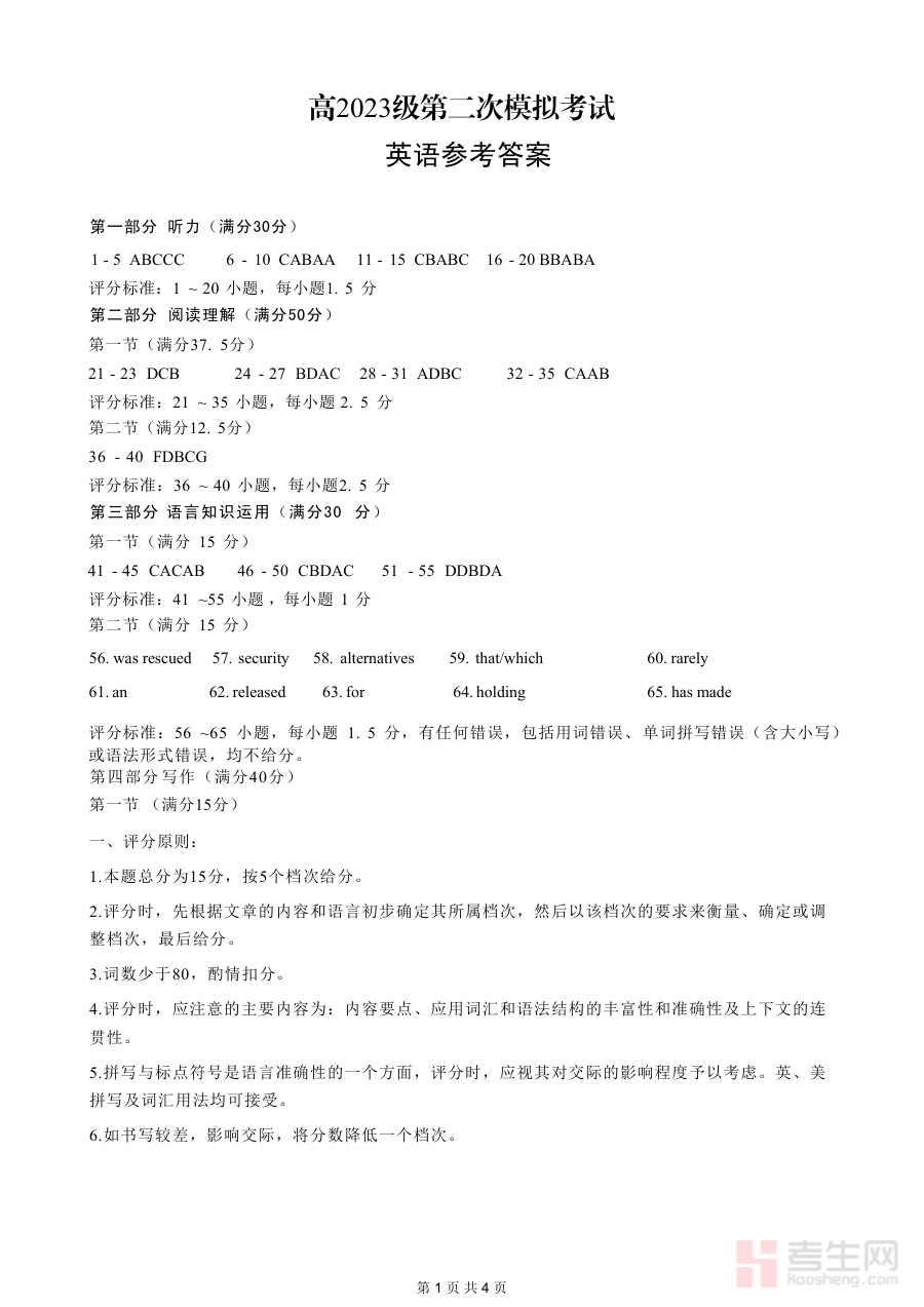 《广安市高2023级第二次模拟考试 英语答案》是针对四川省广安市2023级高中学生的第二次模拟考试所配套的英语科目答案资料,属于区域性高中阶段重要模拟考试的辅助材料。作为广安市教育系统组织的阶段性评估资源,它与本次模拟考试试卷紧密对应,旨在为参与该次考试的师生提供权威且准确的参考答案依据,帮助师生快速核对考试结果,确保对考试成绩的准确评估,是该阶段英语学科备考过程中不可或缺的参考资源之一。