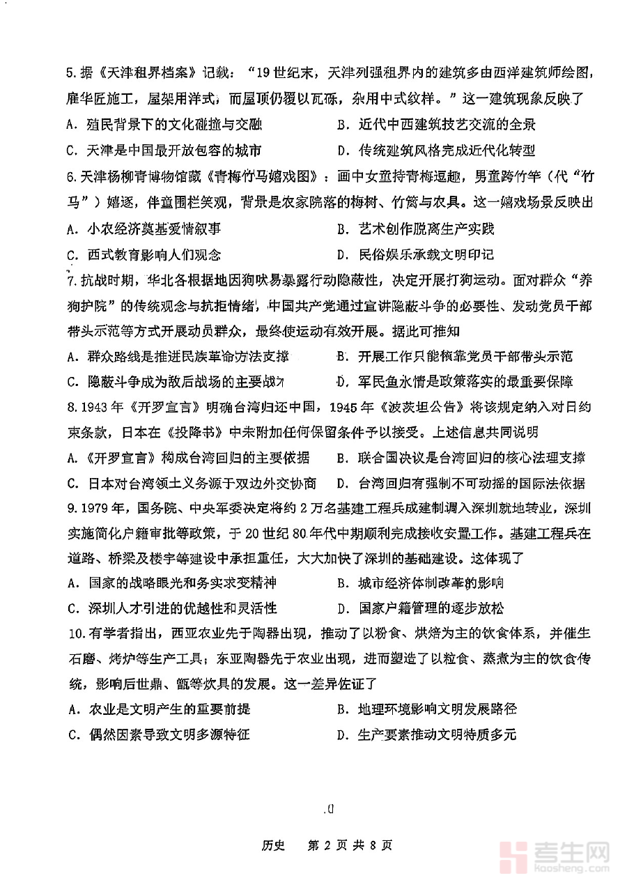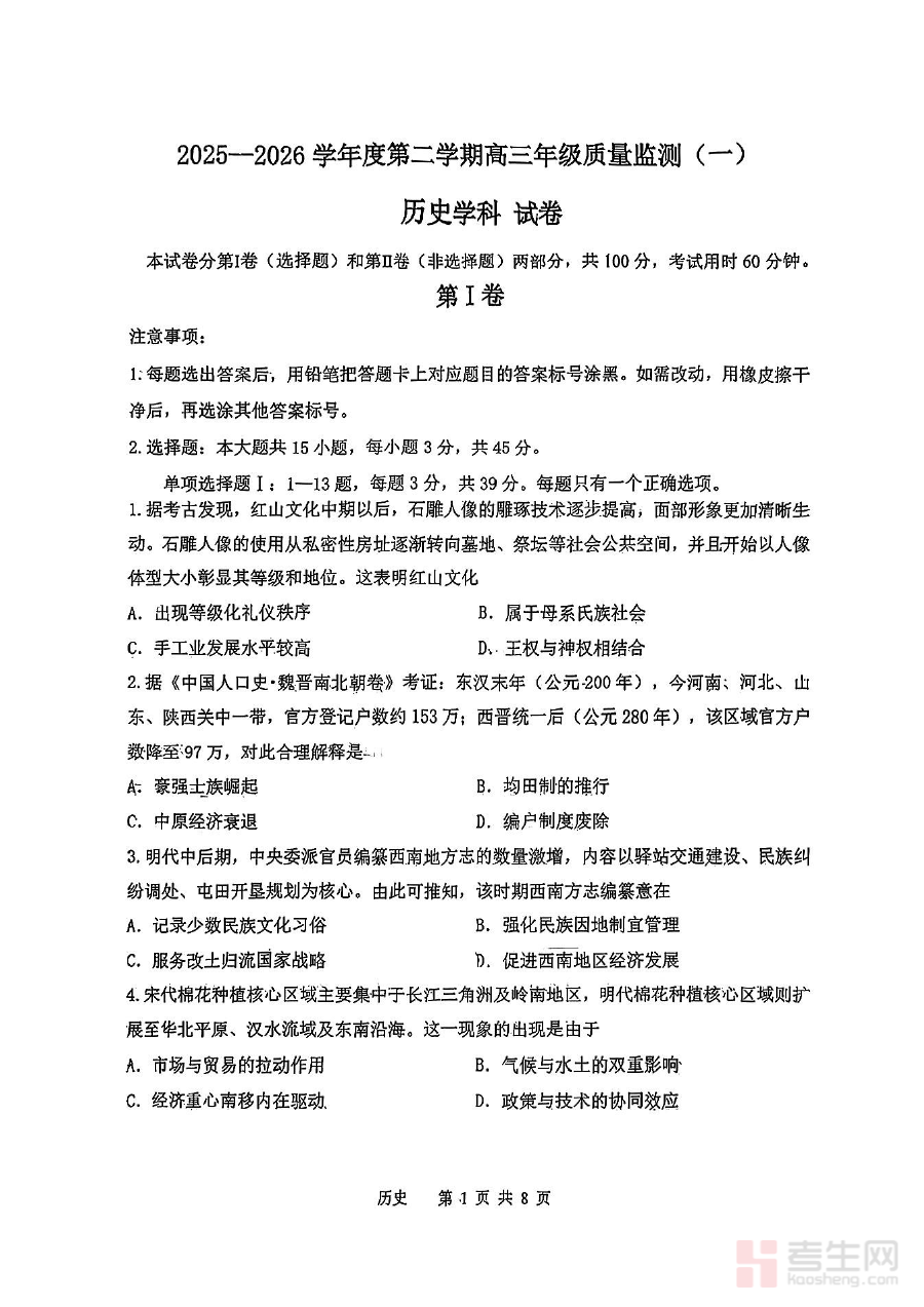 《南开区2026高三一模【历史试卷】》是天津市南开区针对2026届高三学生设计的历史学科模拟考试资料,属于高三年级阶段性检测范畴的重要备考资源。作为区域内标准化的模拟试卷,它贴合本地高三历史教学进度与考试要求,在考试形式、时间设置及考查方向上与正式一模考试保持一致,为学生提供了贴近真实考试场景的练习载体,助力学生提前熟悉考试流程与题型结构框架。