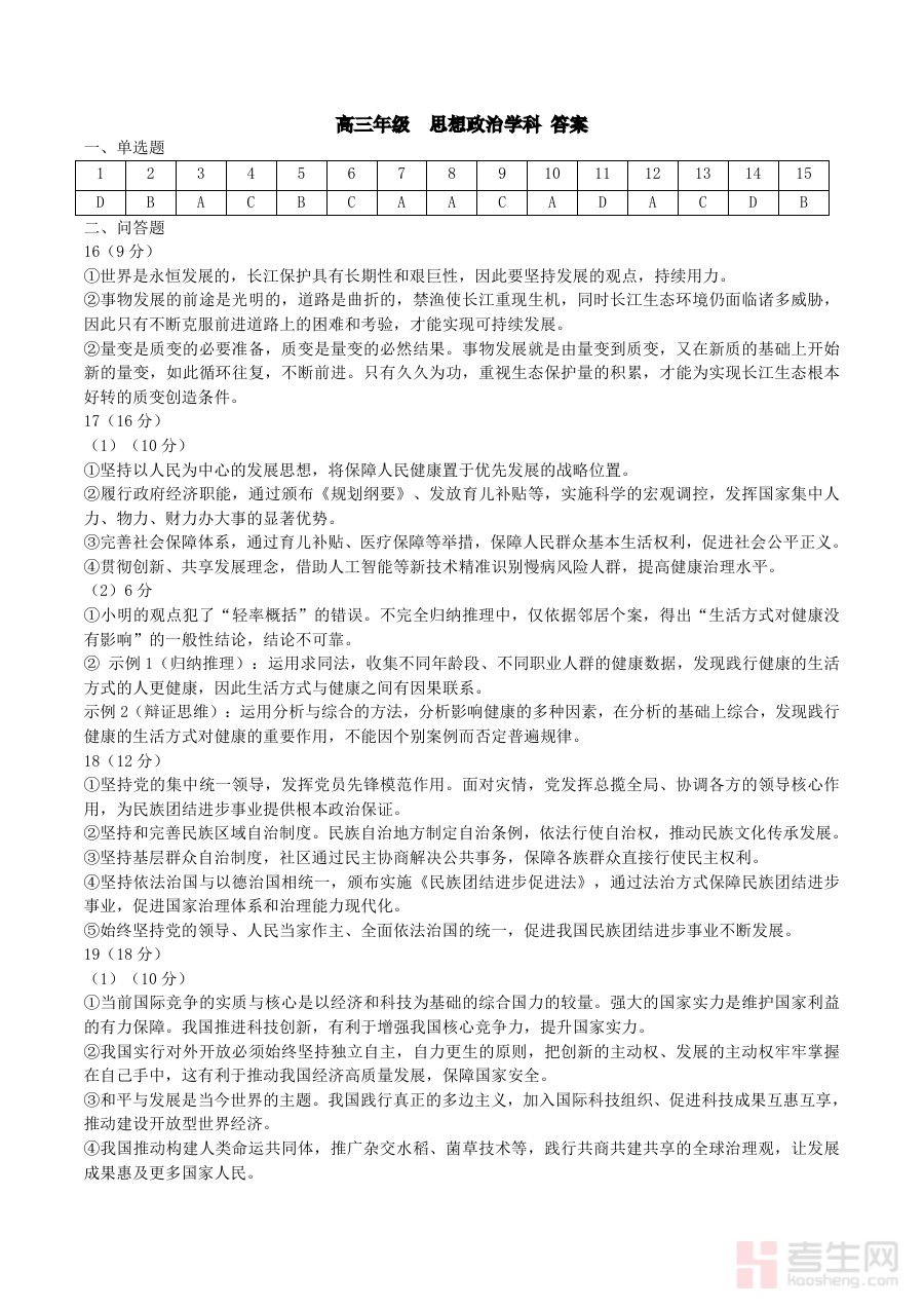 该资料可作为学情诊断的核心工具,帮助学生快速核对答题结果,明确自身在政治学科知识掌握、答题技巧应用等方面的薄弱环节;同时为教师提供教学效果反馈的重要参考,便于教师根据学生整体答题情况调整后续复习计划与教学策略,优化教学内容的针对性;还能辅助学生进行个性化的查漏补缺,提升复习规划的科学性与效率。
