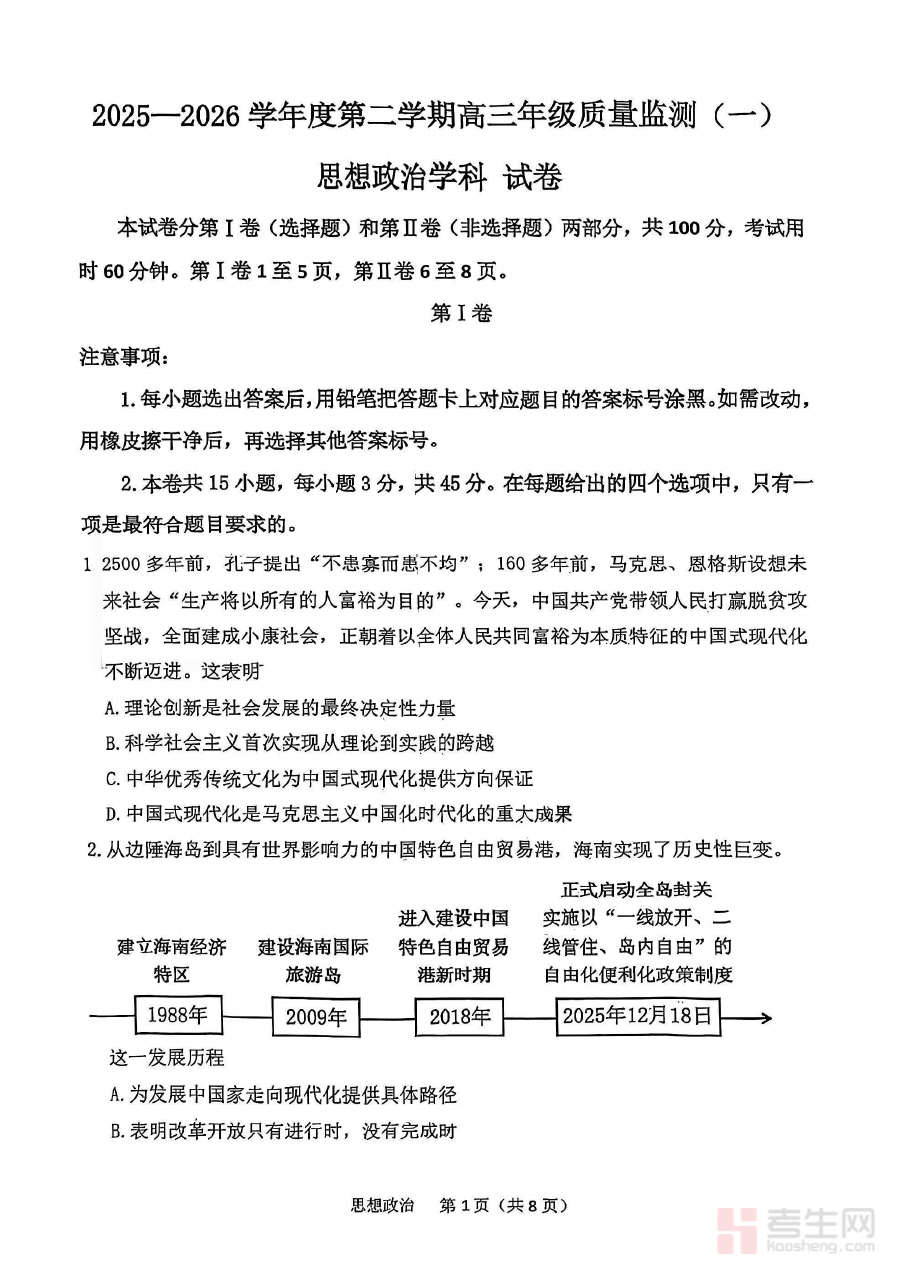 《南开区2026高三一模【政治试卷】》是天津市南开区针对2026届高三学生组织的第一次模拟考试政治学科试卷,属于高考备考阶段重要的阶段性检测资料。该试卷贴合南开区本地教育教学实际与高考命题导向,能够为考生提供符合区域考试要求的实战练习场景,帮助考生提前熟悉模拟考试的形式与节奏。
