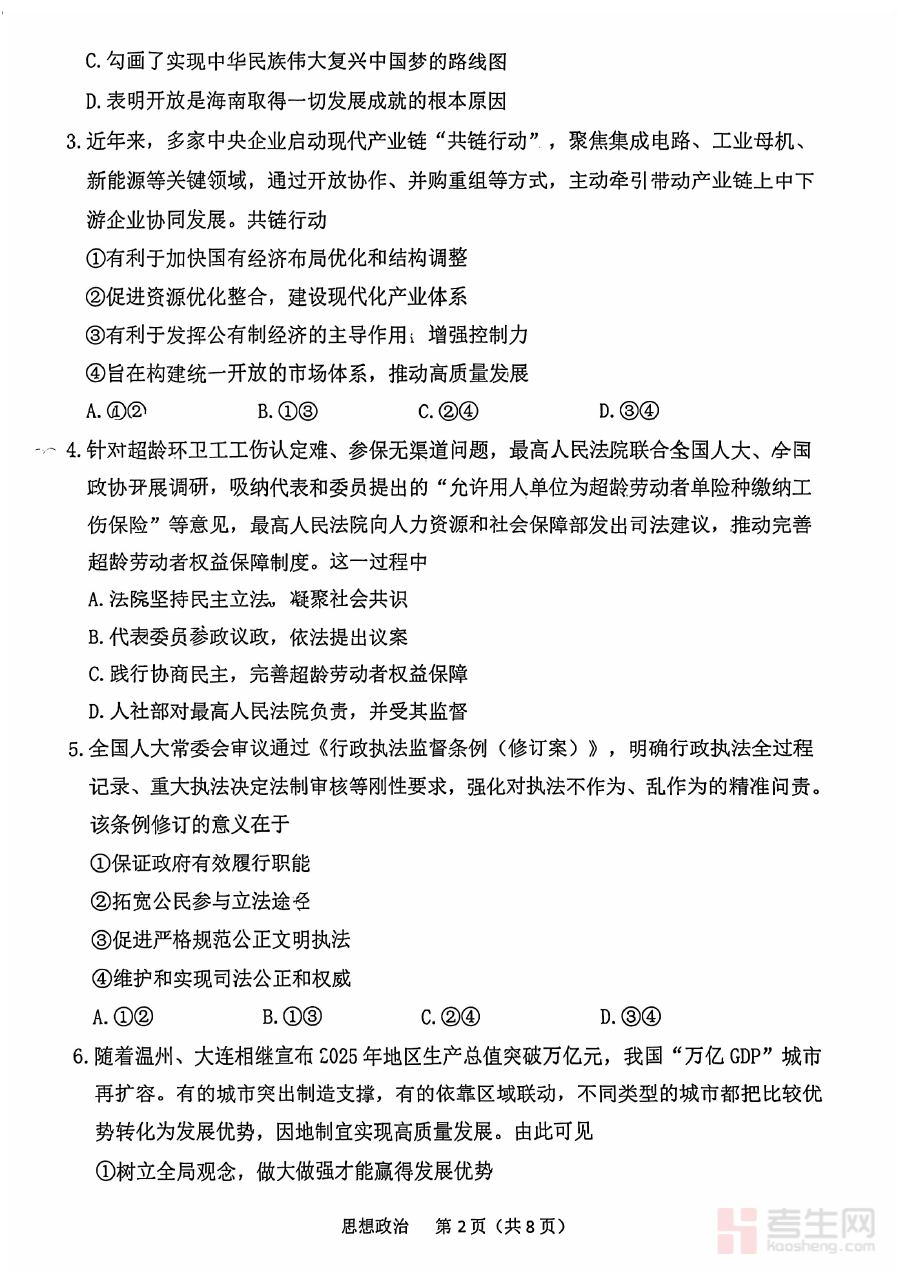 本试卷主要适用于2026届天津市南开区高三学生,也可供其他地区备考高考政治的高三学生参考使用。作为高考前关键的阶段性检测工具,它能帮助考生提升应试能力与时间管理技巧,提前适应高考政治考试的氛围与要求;通过模拟考试实践,考生可进一步巩固所学知识,优化答题思路,为后续高考冲刺奠定坚实基础。