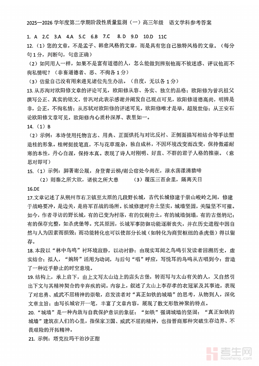 此答案资料可有效支持高三学生的学情诊断与自我评估工作,帮助考生在完成模拟考试后快速核对答题结果,清晰识别自身在语文知识运用、解题逻辑与表达规范等方面的薄弱环节;同时也能为教师提供客观的评分标准与答题分析框架,助力教师全面掌握班级学生的整体学习状况,调整教学重点与复习策略,优化后续的备考规划与训练安排。此外,它还可作为备考过程中的阶段性检测工具,辅助师生及时发现备考中的问题并进行针对性改进。